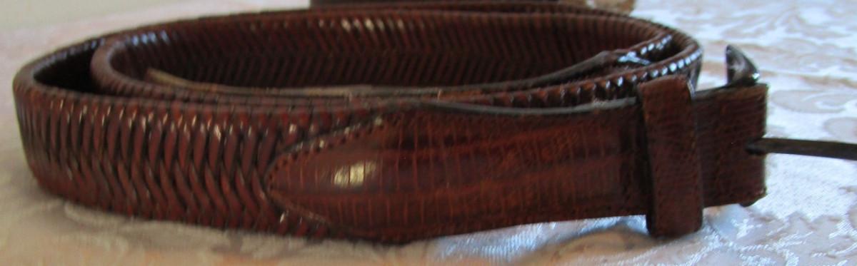 3 leather belts, one is Bill Blass alligator pattern size 42, one Leather woven belt size 42,  one brown leather belt with elk buckle size 46
