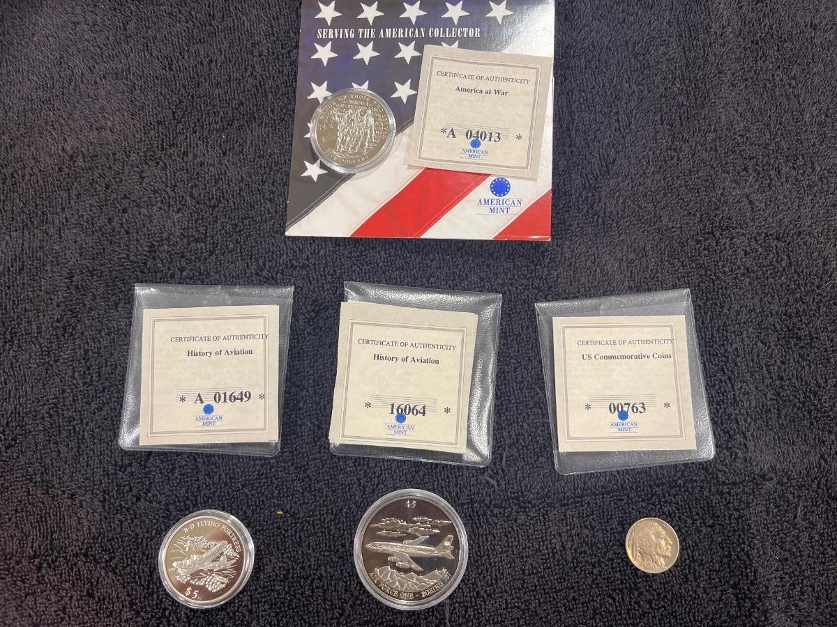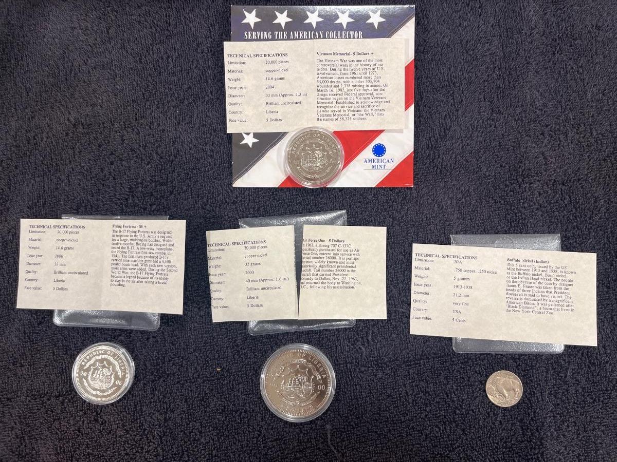 3 Liberia 5 Dollar Coins and 1 Buffalo Nickel