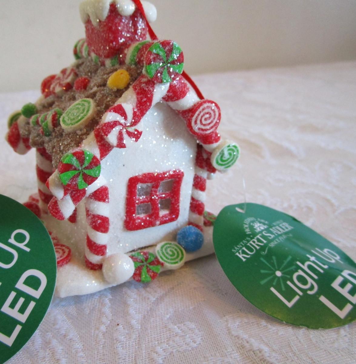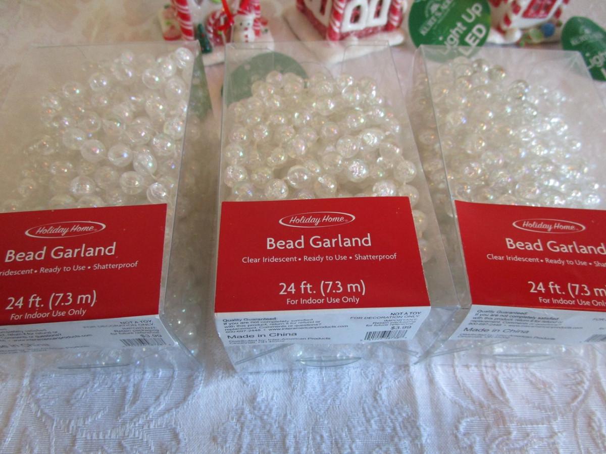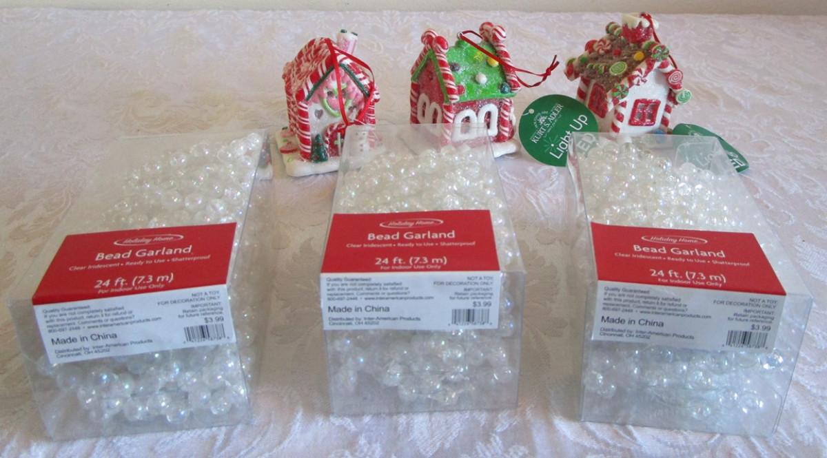 3 Light-up gingerbread house ornaments, 3 24' each bead garlands