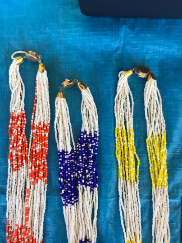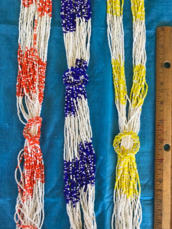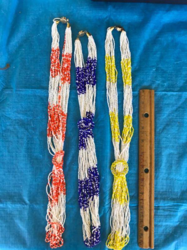 3 Multi-strand seed bead necklaces. All are white with another color, blue, orange and yellow.