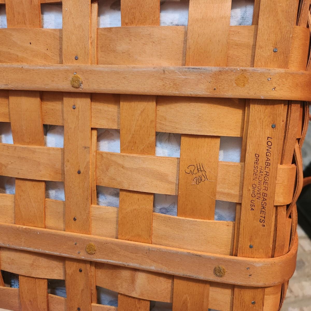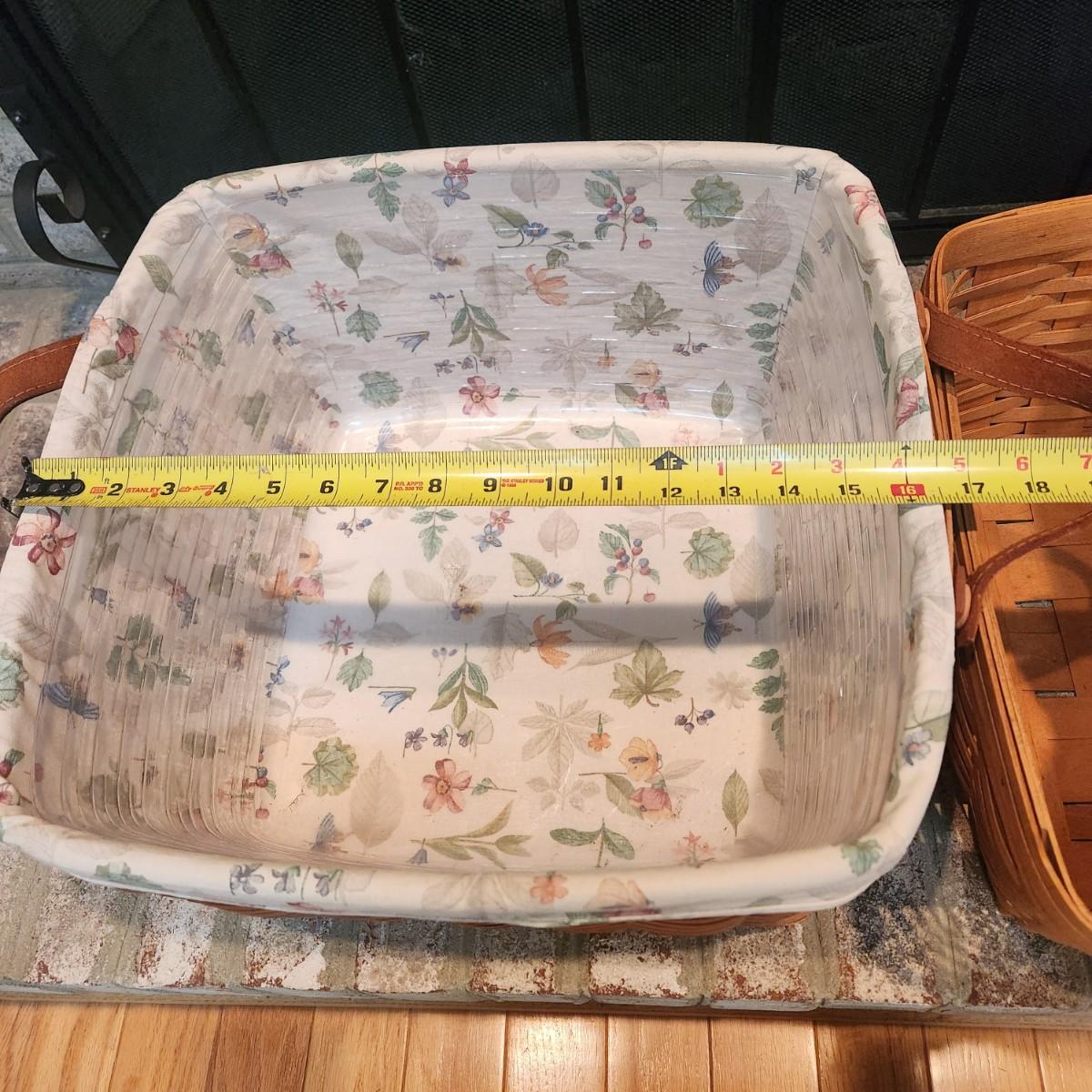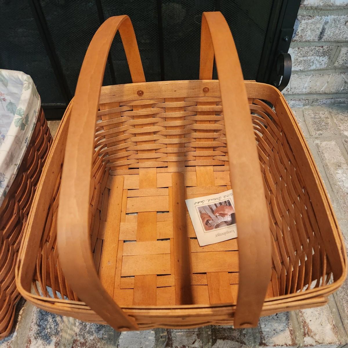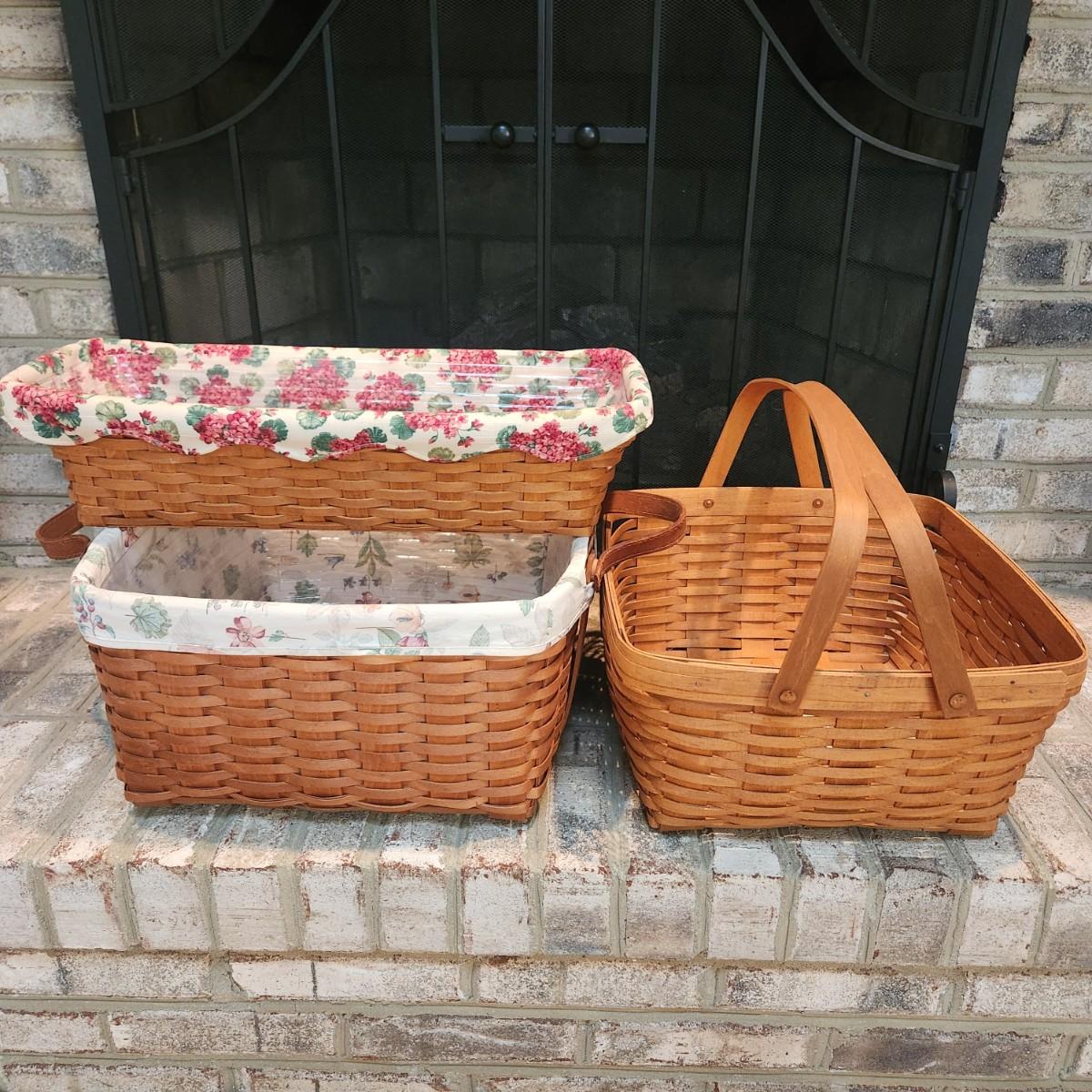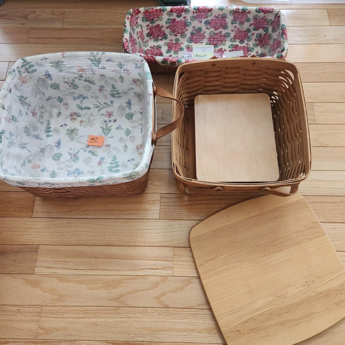 3 Longaberger Baskets 2001 2002 2 with Liners and Protectors, 1 basket w Lid & Tray