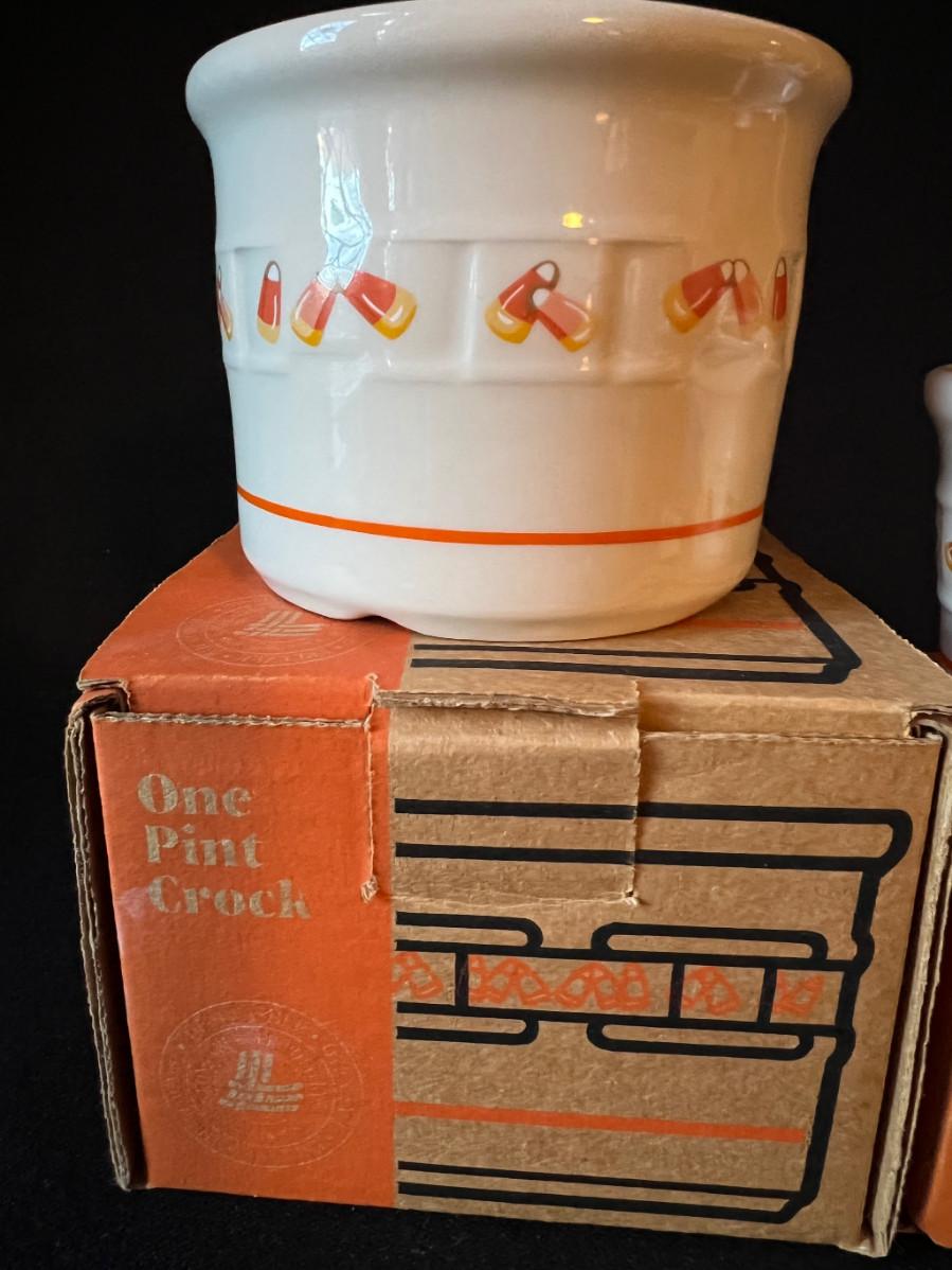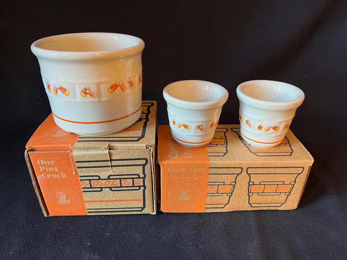 3 Longaberger Halloween Pottery "Candy Corn" Pattern 1 Pint Crock / Planter and 2 Votives w/ Boxes!