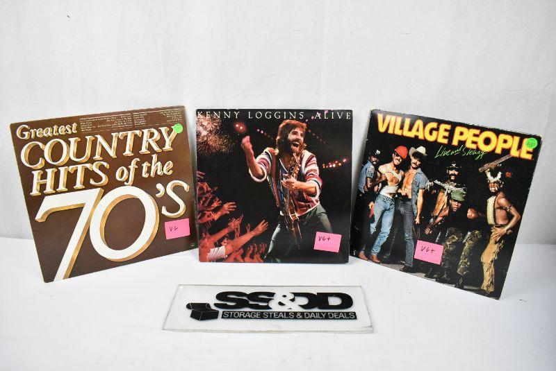 3 LP Record Albums: Greatest Country Hits of the 70s (VG) Kenny Loggins "Alive" (VG+) 2 records set, & Village People "Live & Sleazy" 2 records set (VG+)