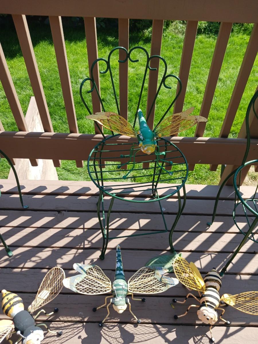 3 METAL CHAIE PLANT STANDS AND GARDEN BUGS