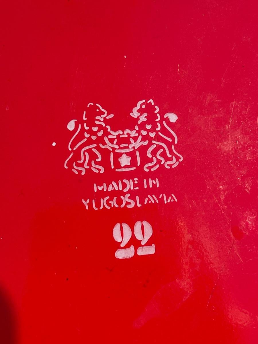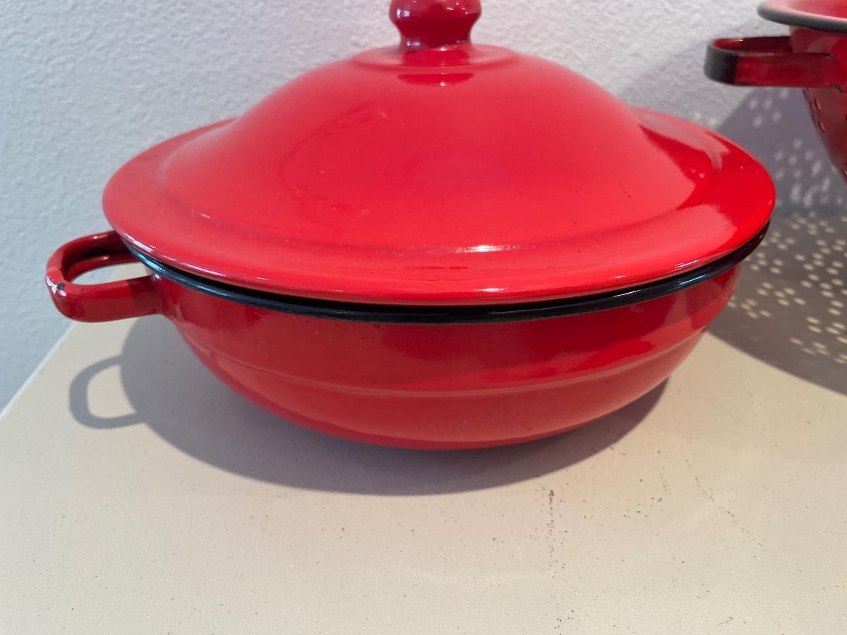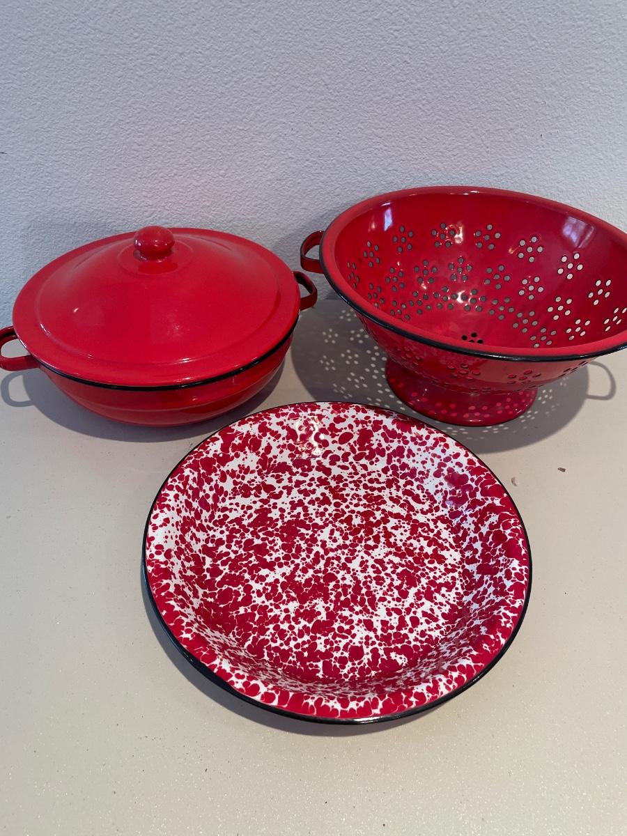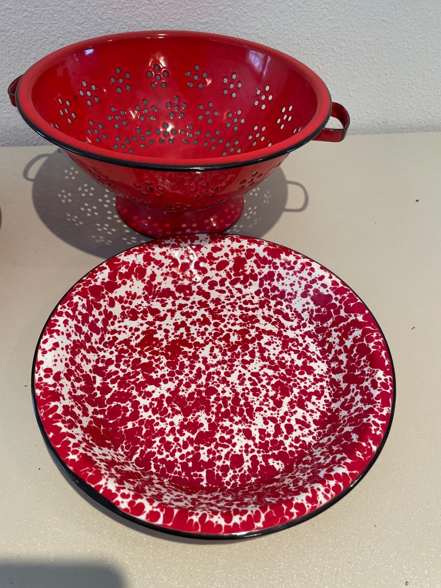 Yugoslavian casserole dish, red metal strainer, enamel, red, and white pie plate