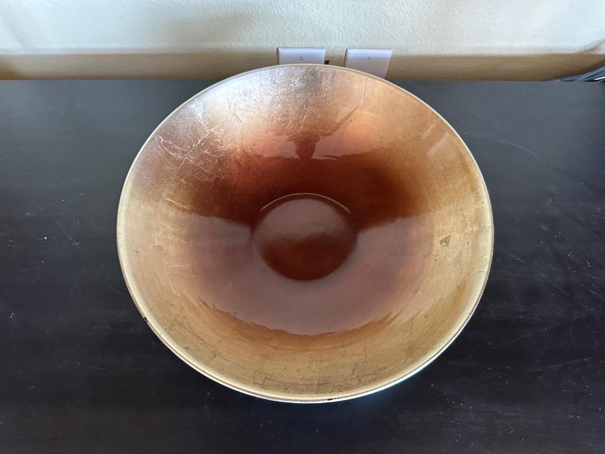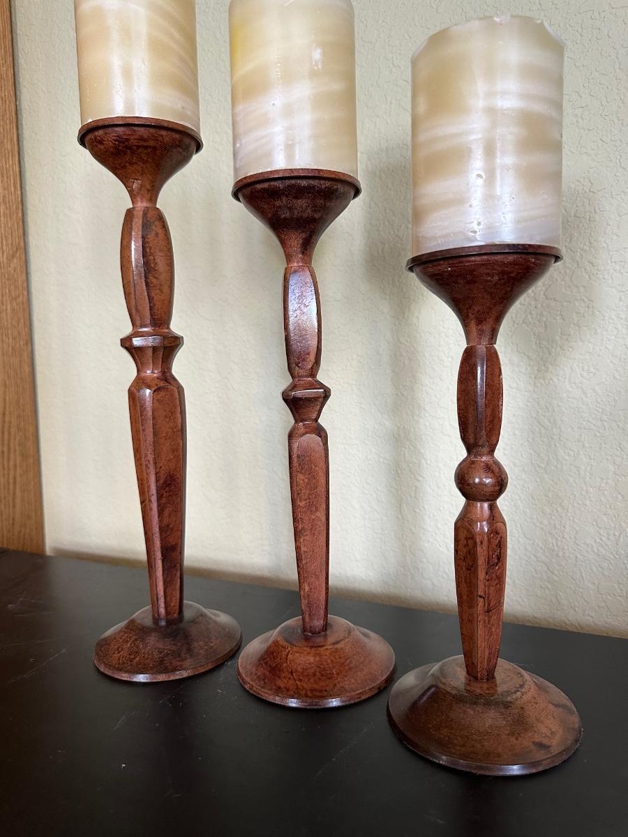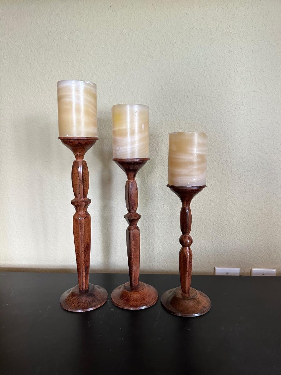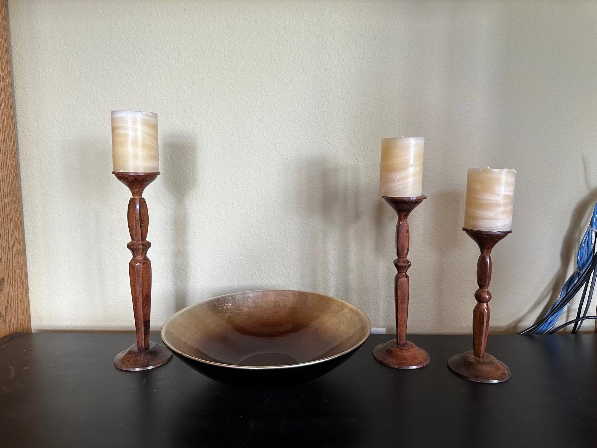 3 METAL STAGGERING CANDLE HOLDERS AND A DECORATIVE BOWL