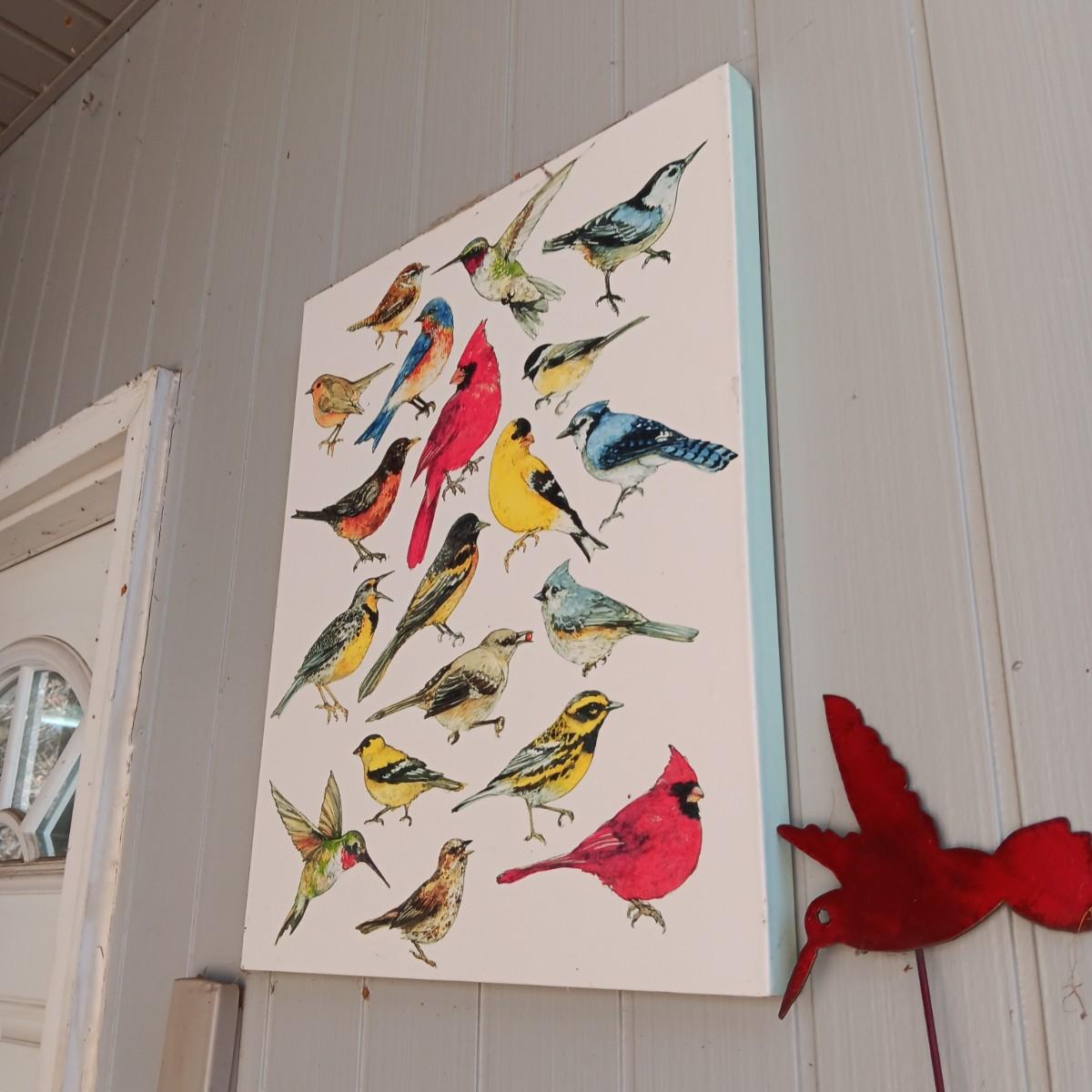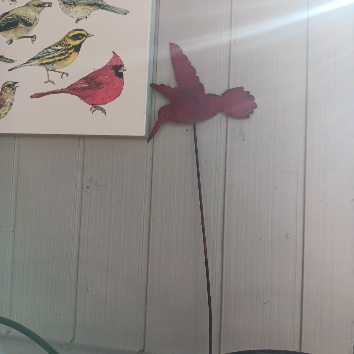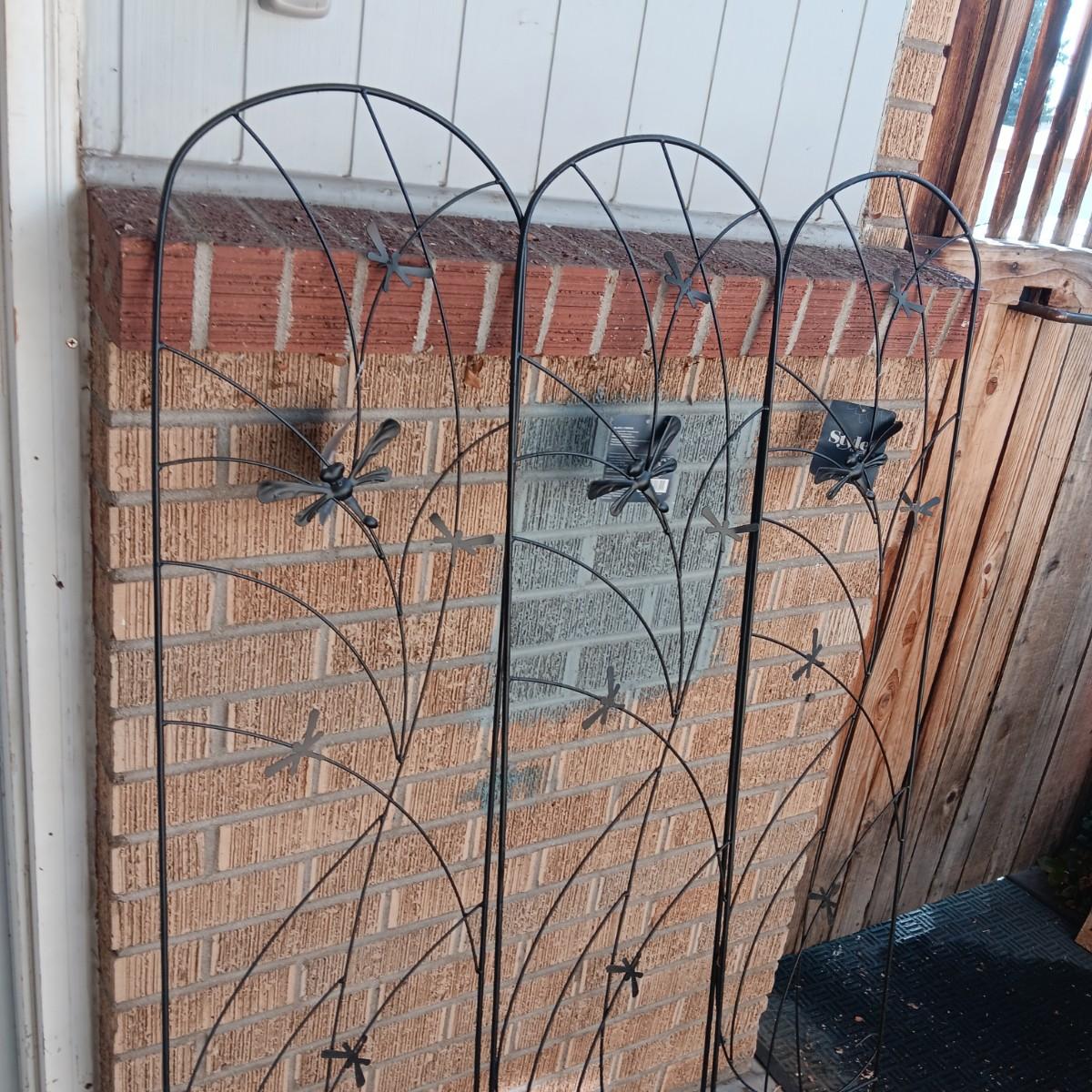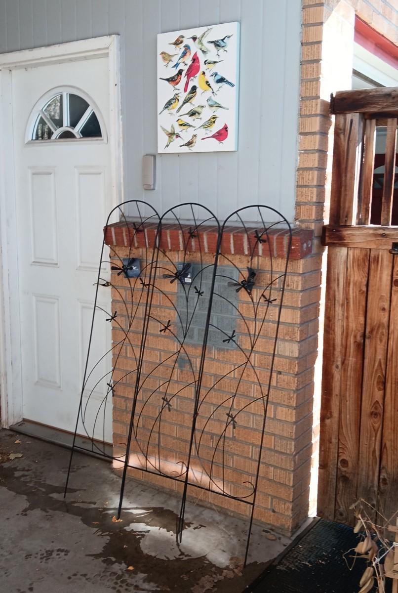 3 METAL TRELLISES, CANVAS PICTURE OF BIRDS AND A STEEL STAKED BIRD