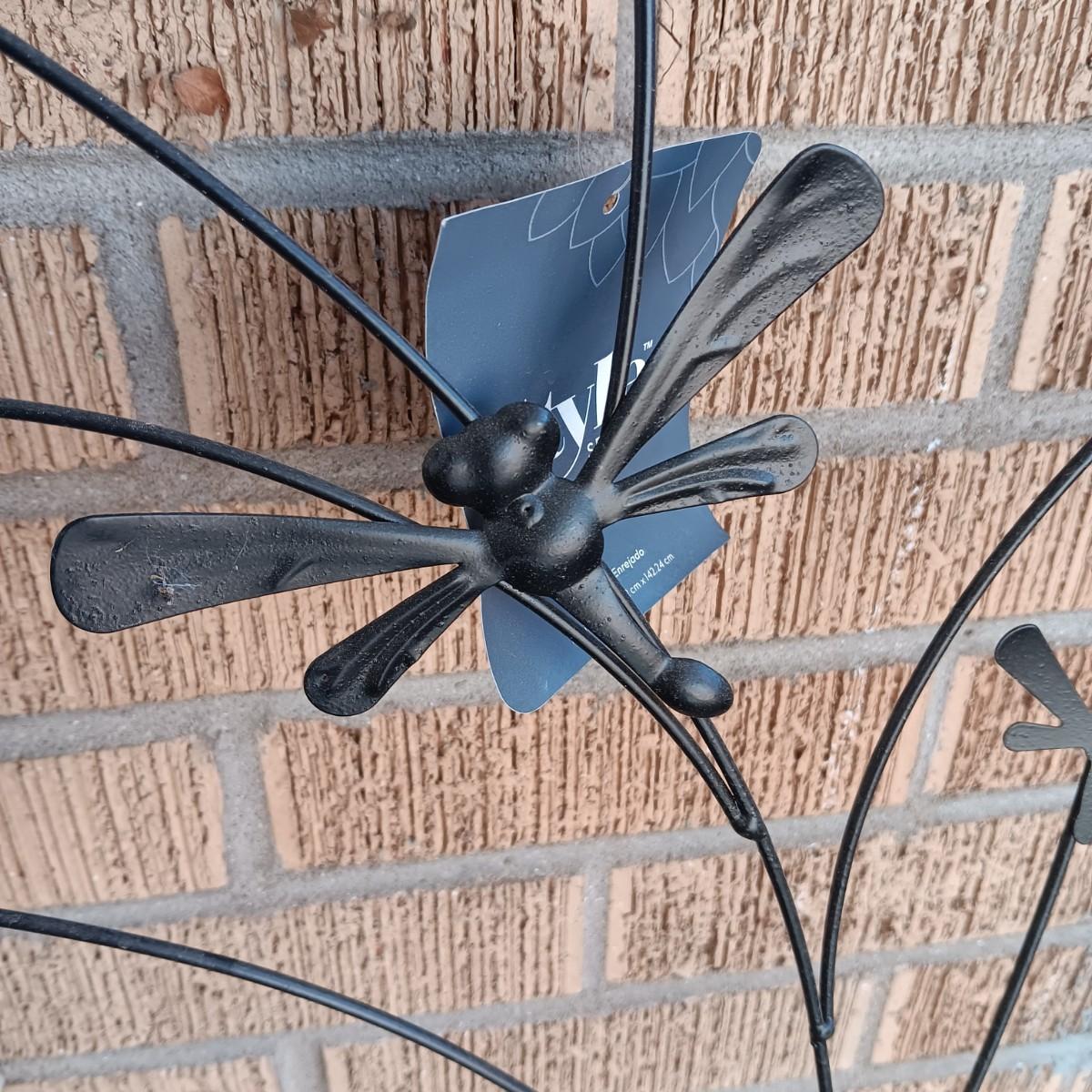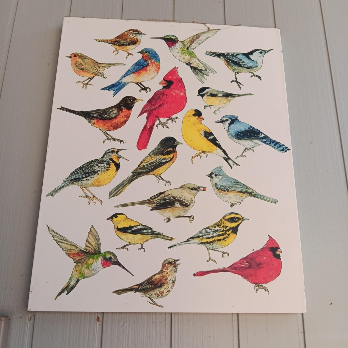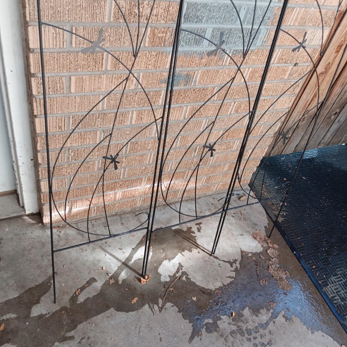3 METAL TRELLISES, CANVAS PICTURE OF BIRDS AND A STEEL STAKED BIRD