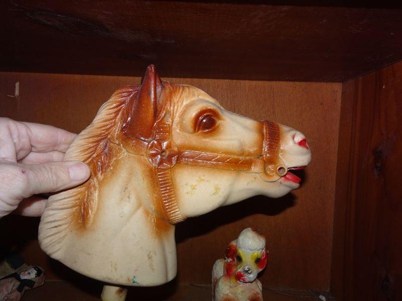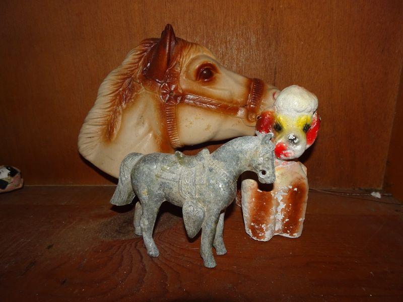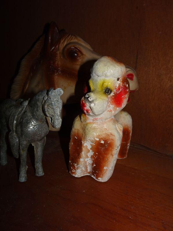 3 Mid Century Figures, Plastic Horse Head for Pony on a Stick, Carnival Chalk Poodle and Metal Horse