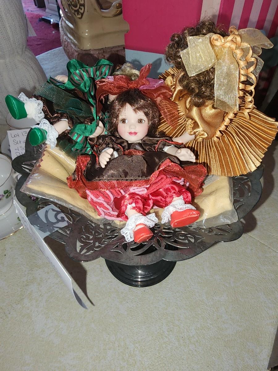 3 mini dolls sitting in silver plated dish