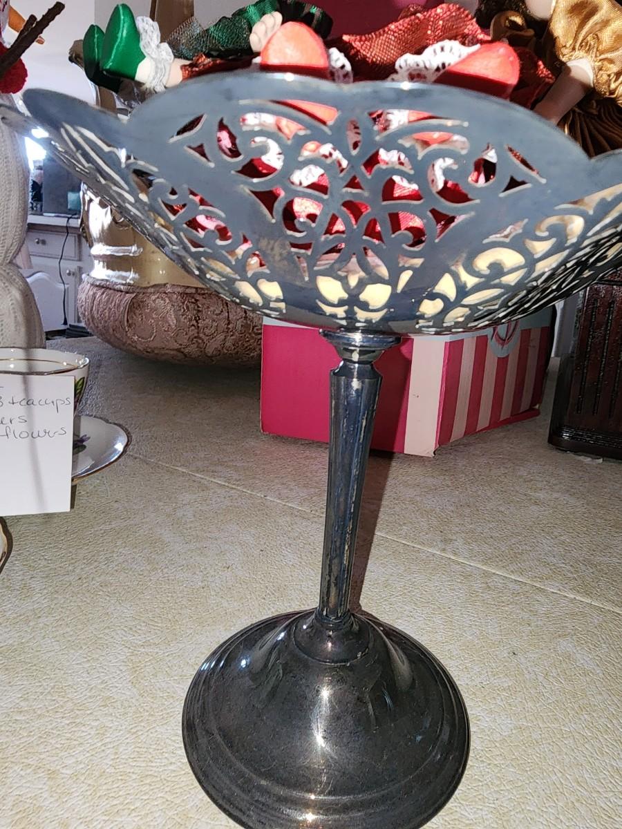 10 in tall dish. 3 ornate dolls. 4 inches tall each