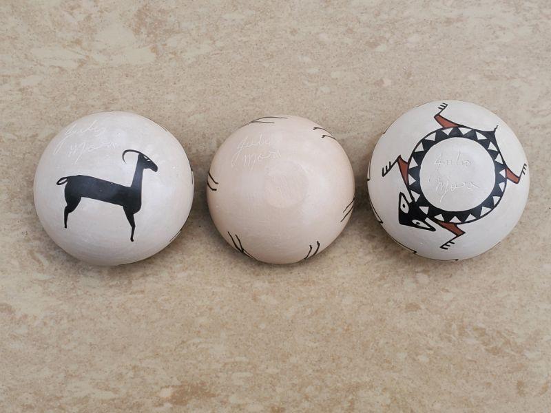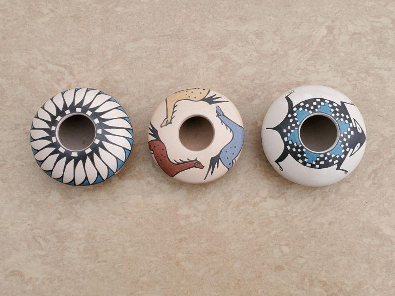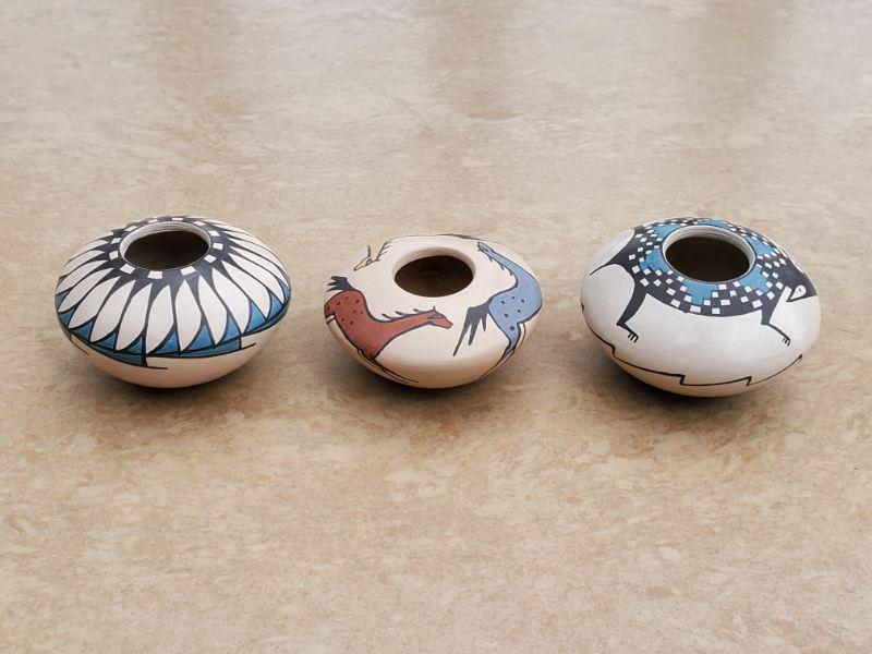 x3 Mini Mata Ortiz Seed Pots, Horse/Feather/Lizard Motifs (Potter: Julio Mora)