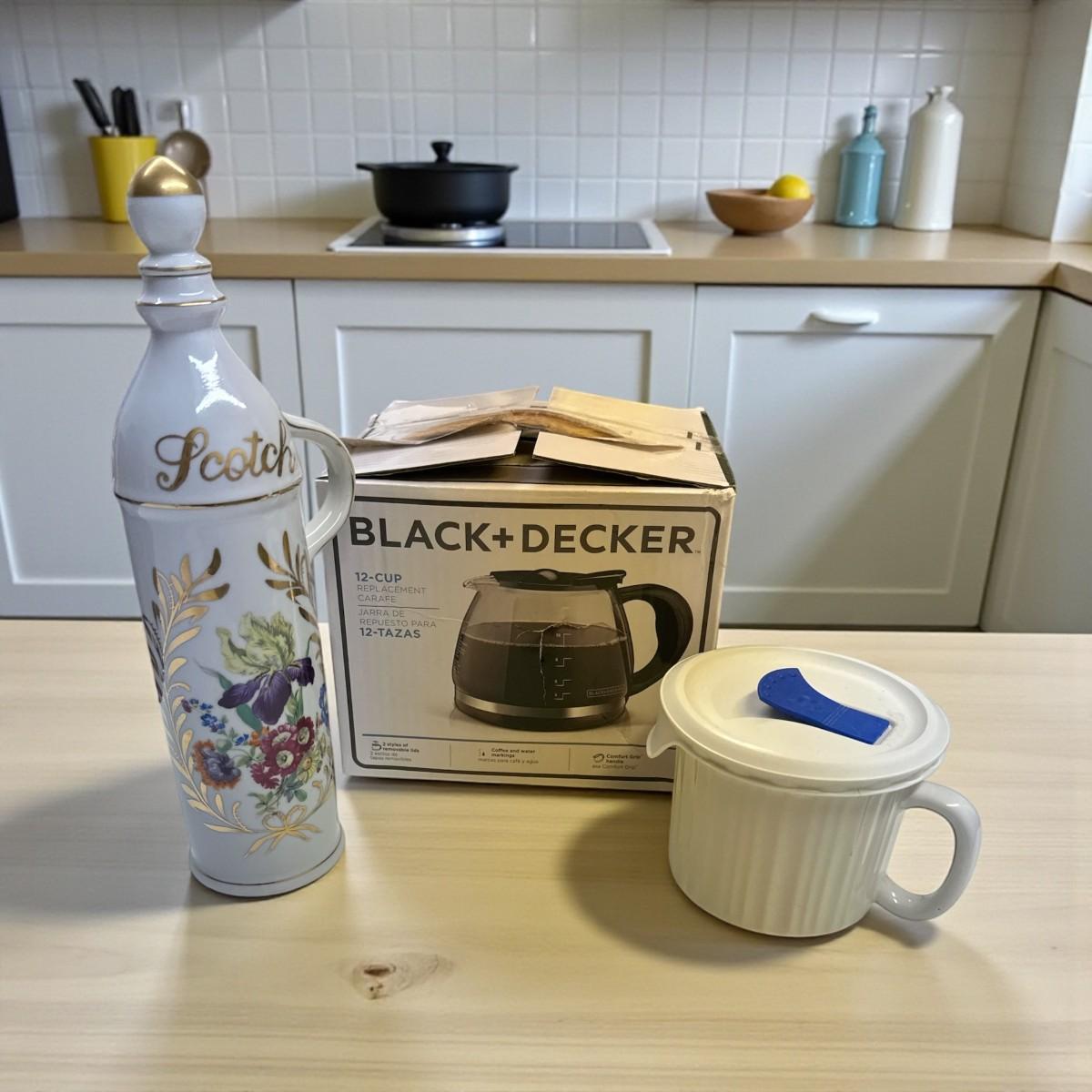 3 Misc. Kitchen Items- New Coffee Carafe, Scotch Decanter, and Corning Ware Jar w Lid