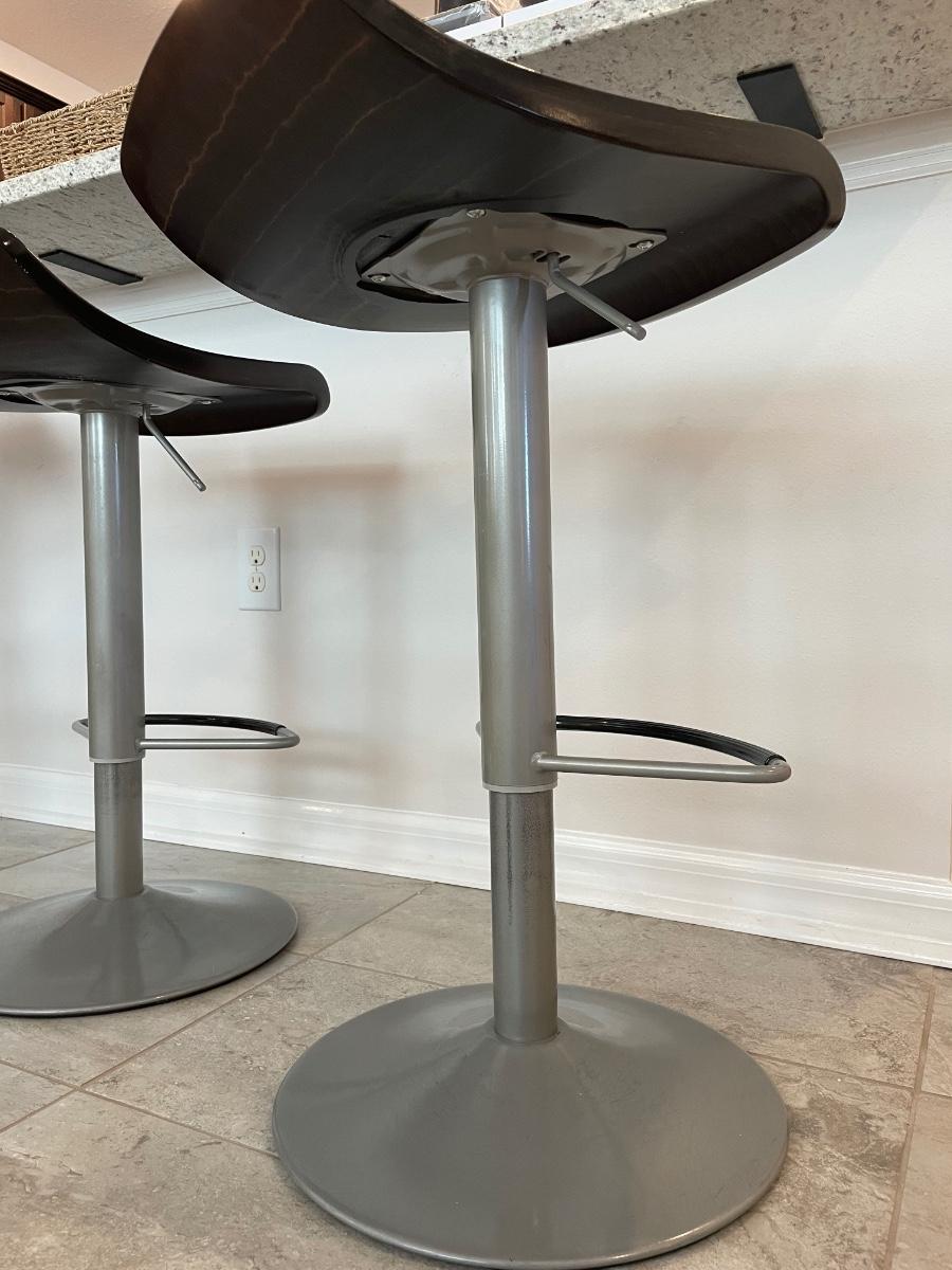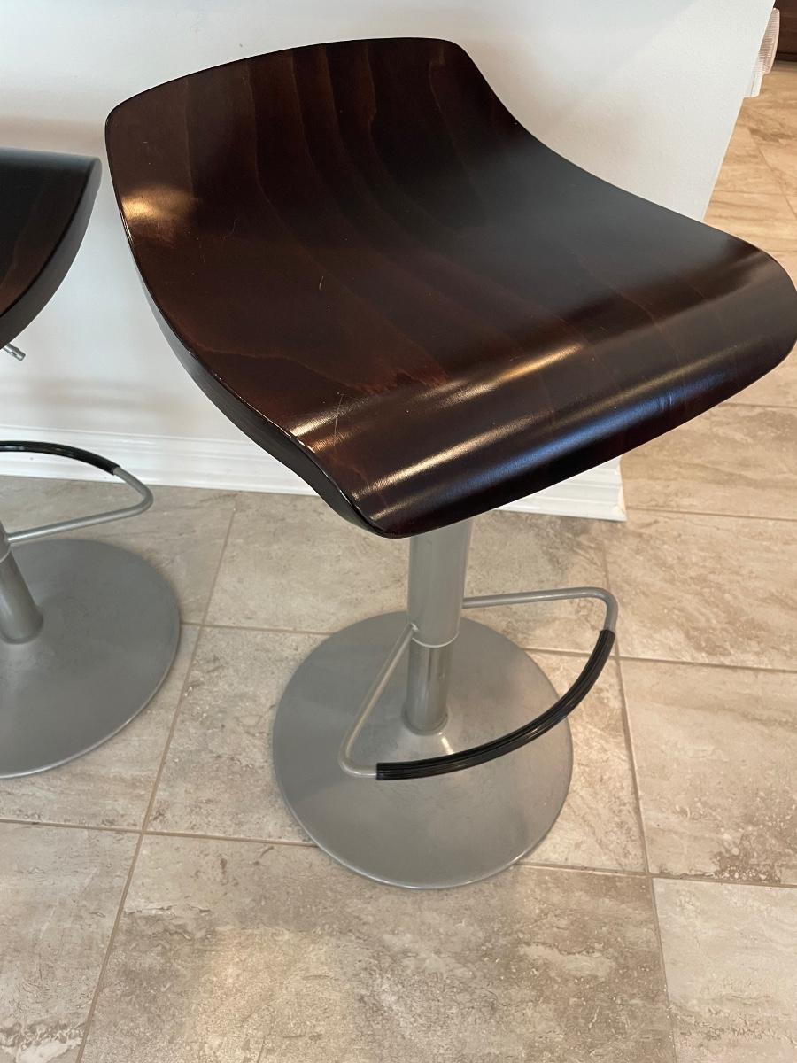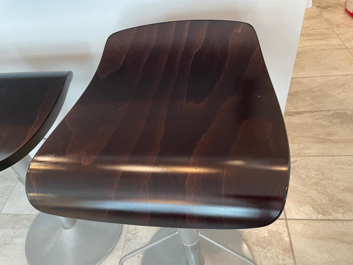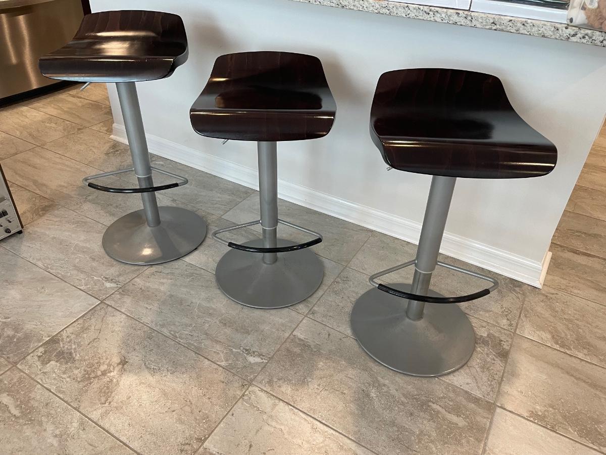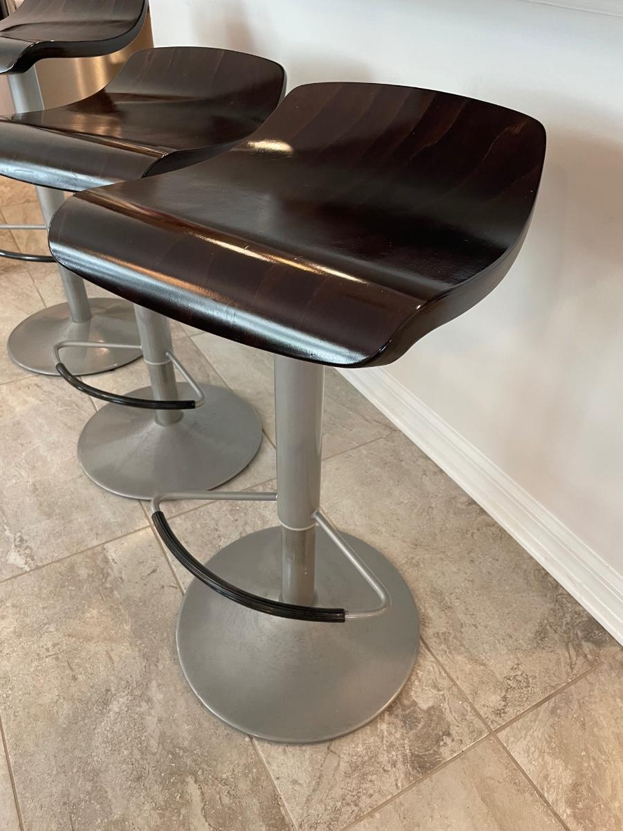 Very nice set of 3 bar stools. They swivel and adjust up and down for height. Chrome bottom with dark wood curved seat. Also has foot rest.
