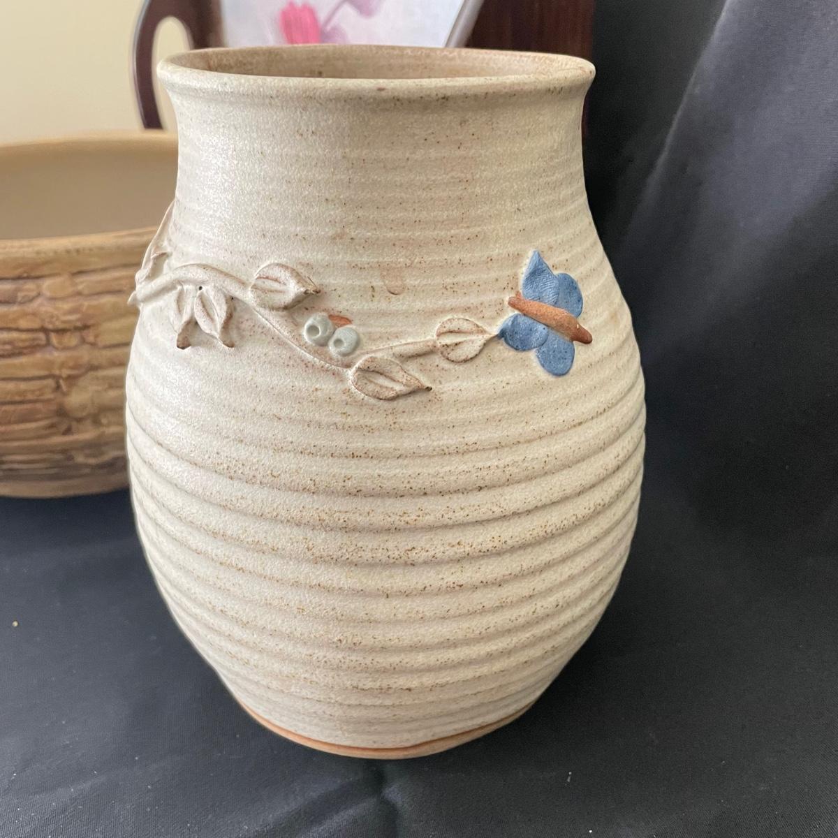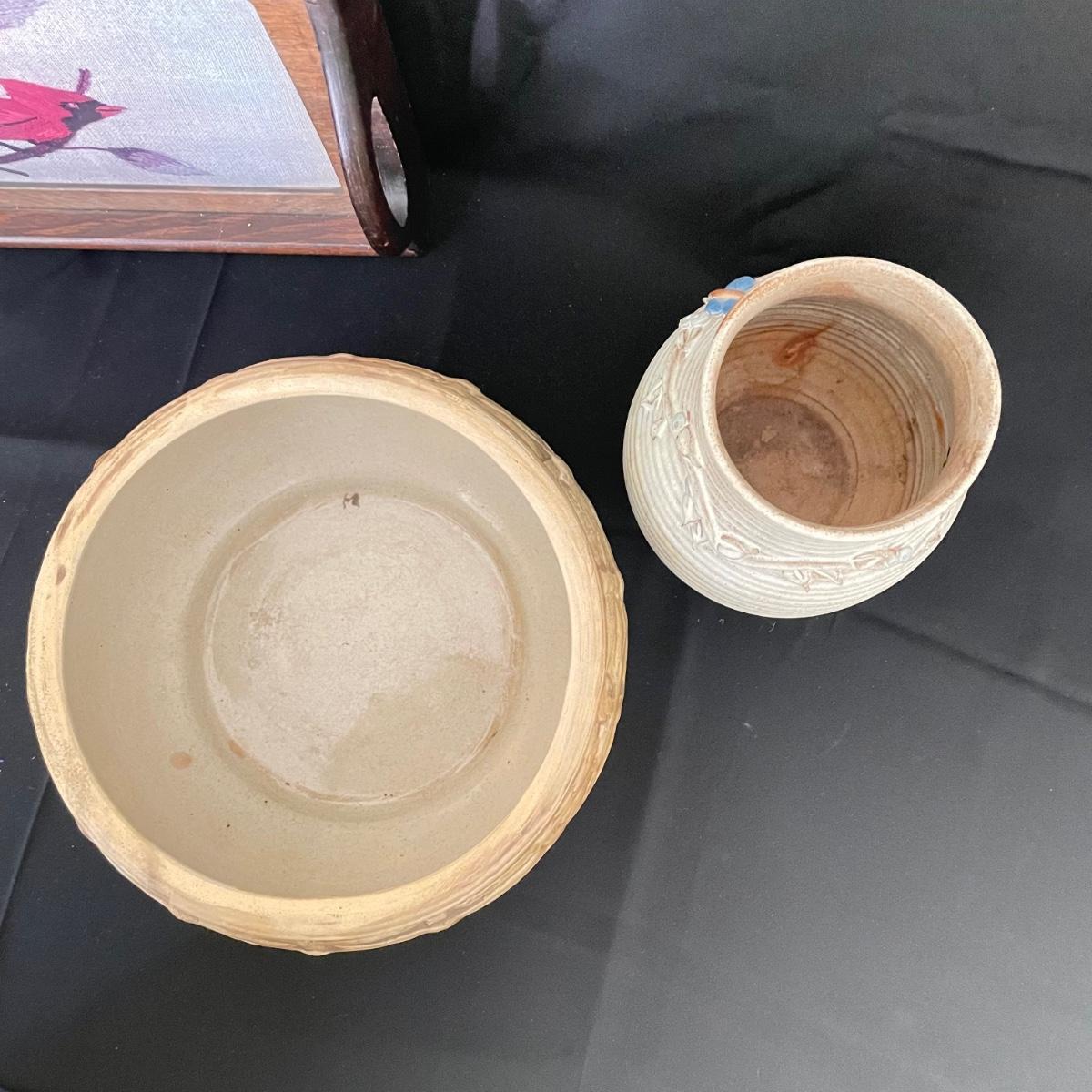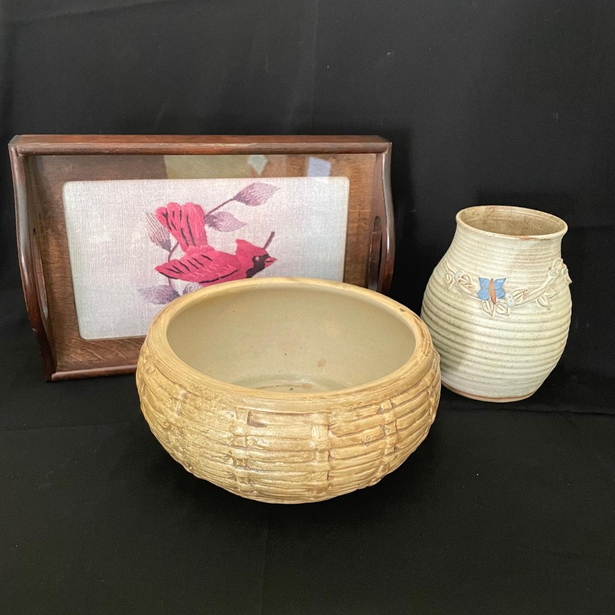 Local favorite, Three Mountaineers, Inc needlepoint tray featuring North Carolina’s State Bird, the Cardinal. Lot also includes a signed hand thrown basket pottery bowl measuring approximately 9”d x 4" and a 6.25” tall hand thrown vase with two butterflies and a vine. See images. Shipping available.