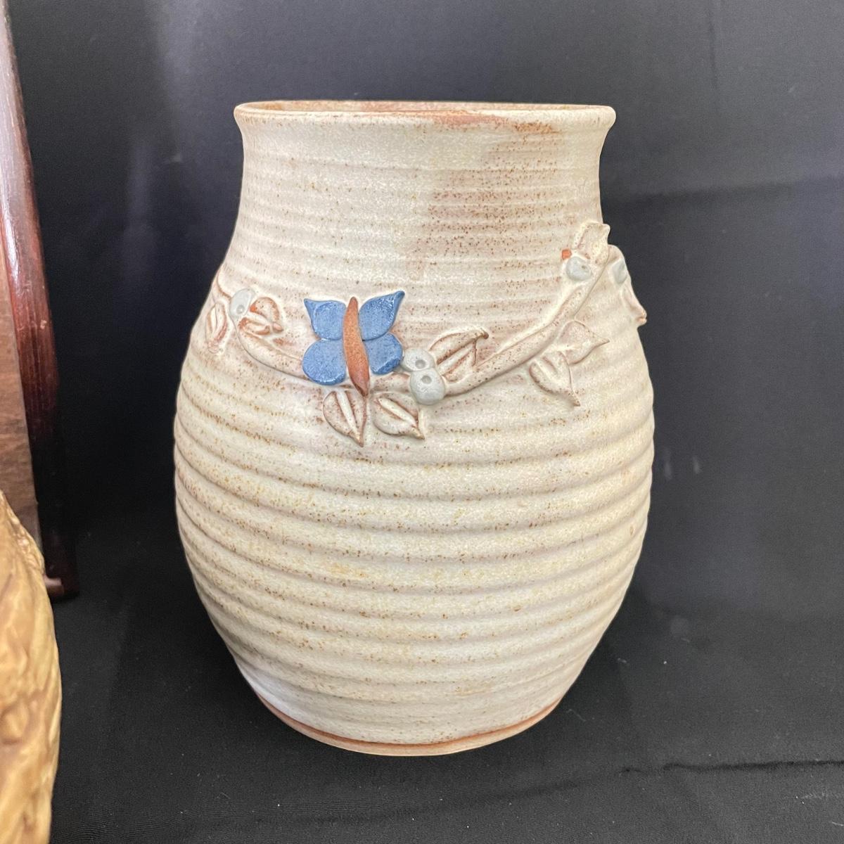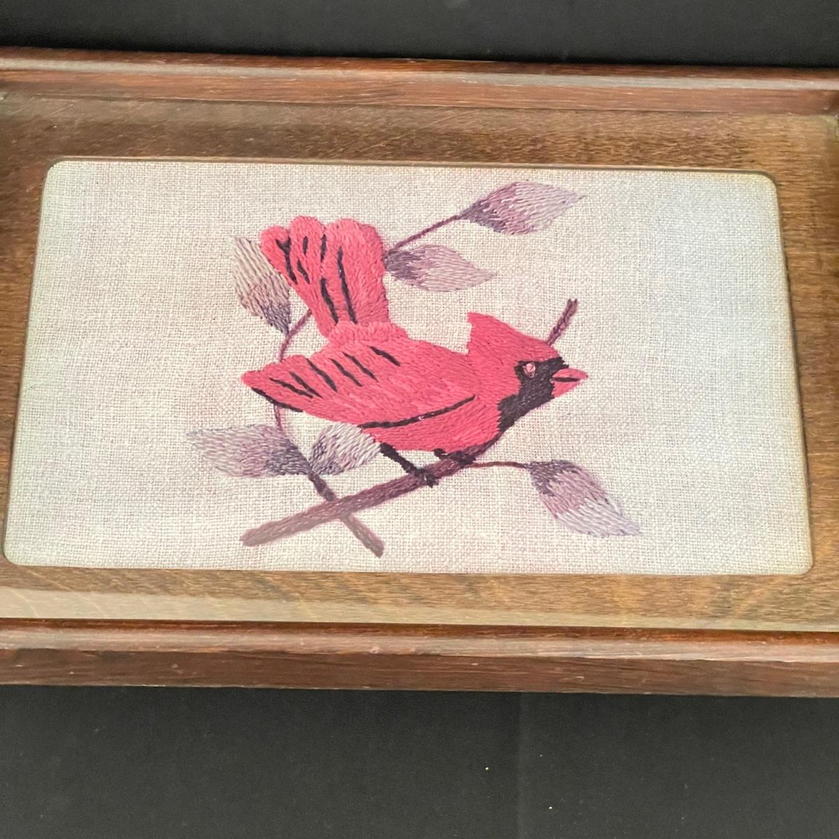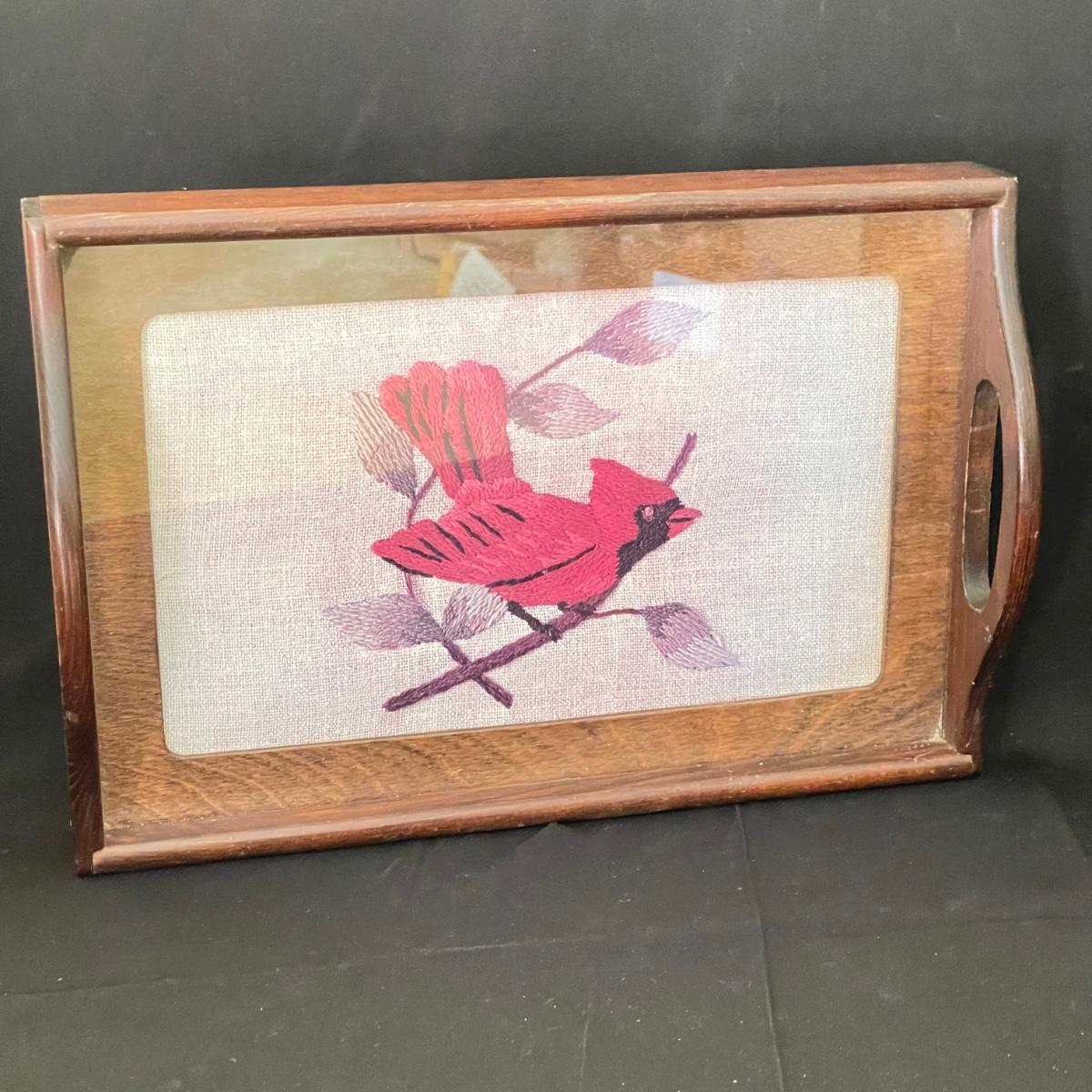 Local favorite, Three Mountaineers, Inc needlepoint tray featuring North Carolina’s State Bird, the Cardinal. Lot also includes a signed hand thrown basket pottery bowl measuring approximately 9”d x 4" and a 6.25” tall hand thrown vase with two butterflies and a vine. See images. Shipping available.