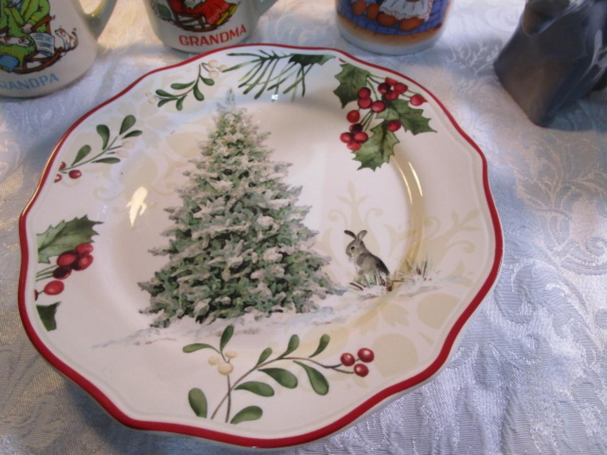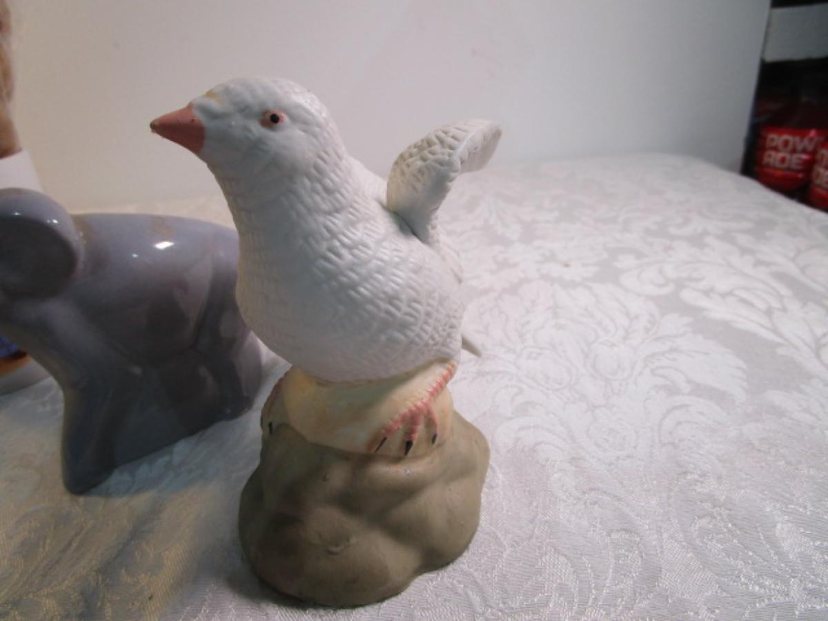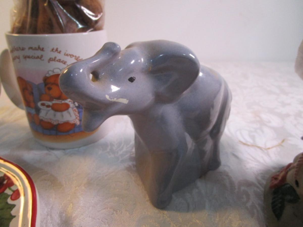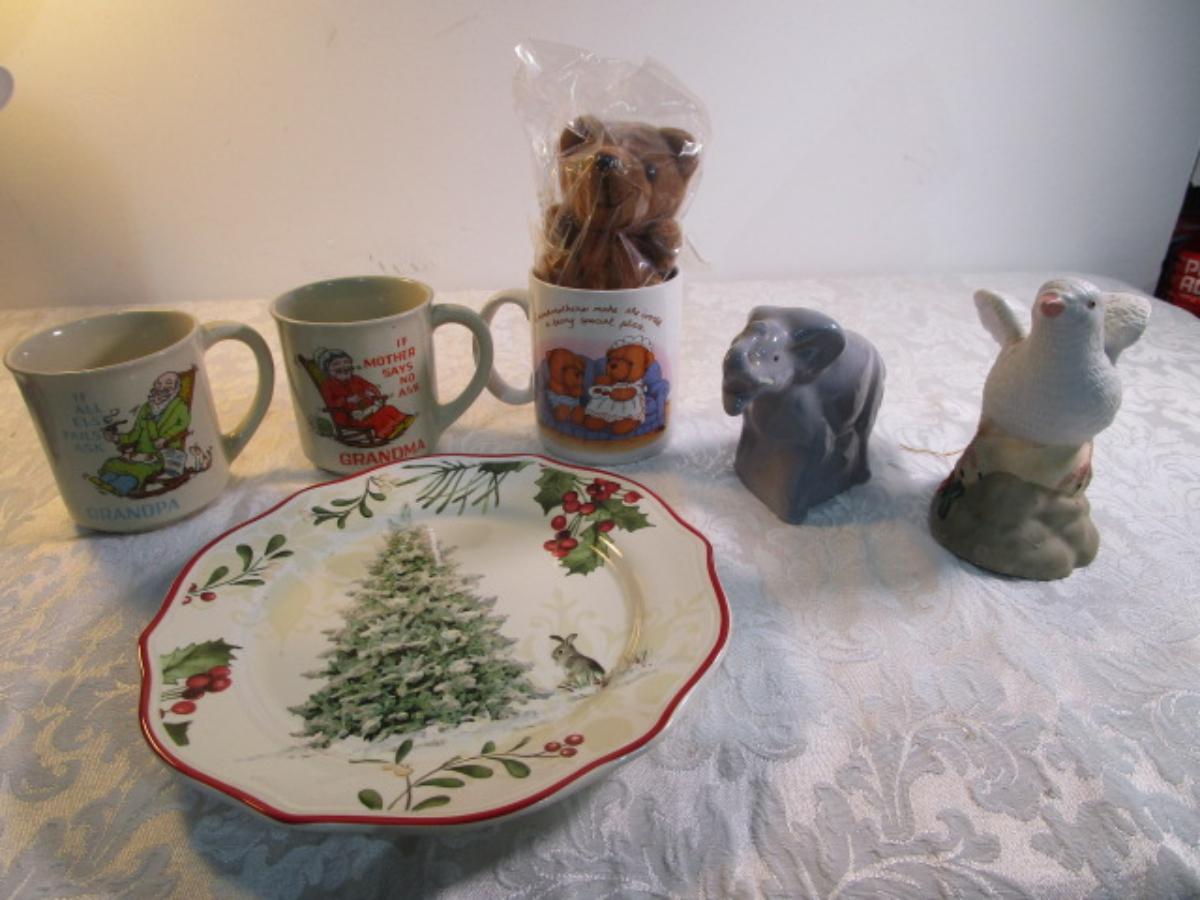 3 mugs, 1 Christmas plate, 1 elephant, 1 dove