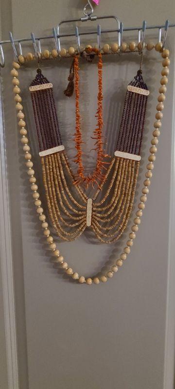 3 necklace lot. Wood bead, coral, and multi strand bead in brown tones.