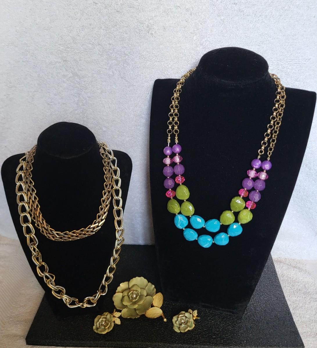 3 NECKLACES AND VINTAGE BROOCH AND EARRINGS SET