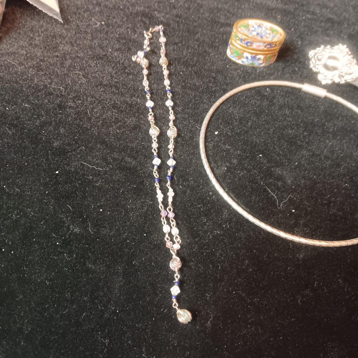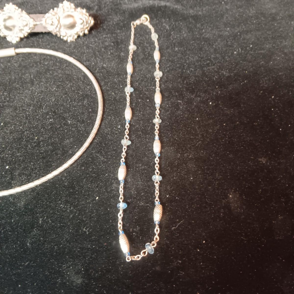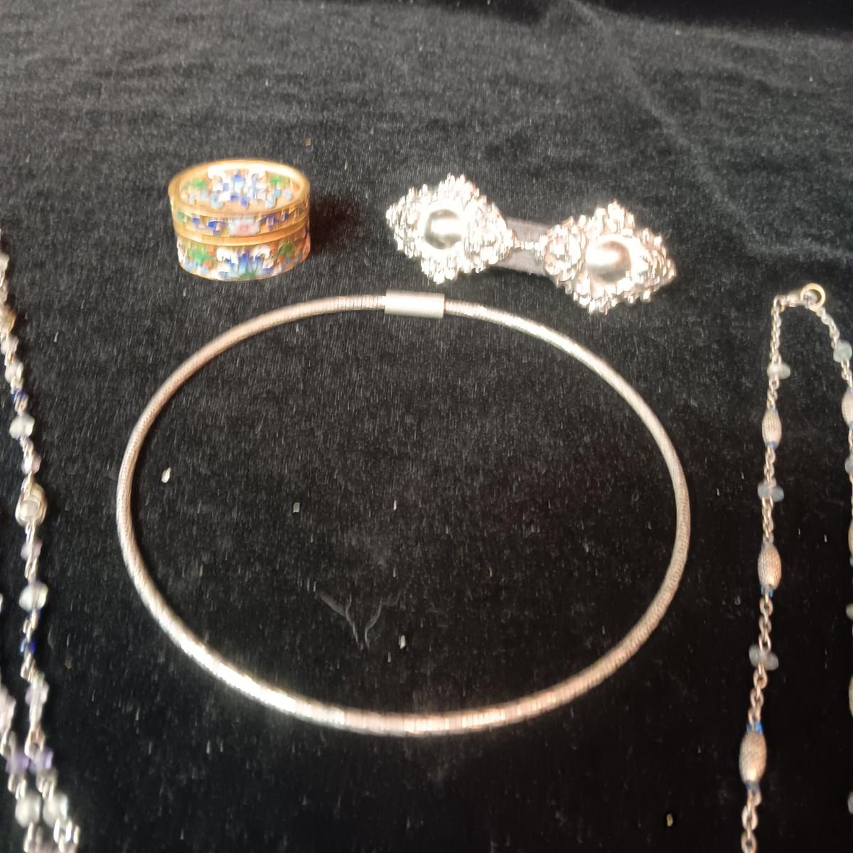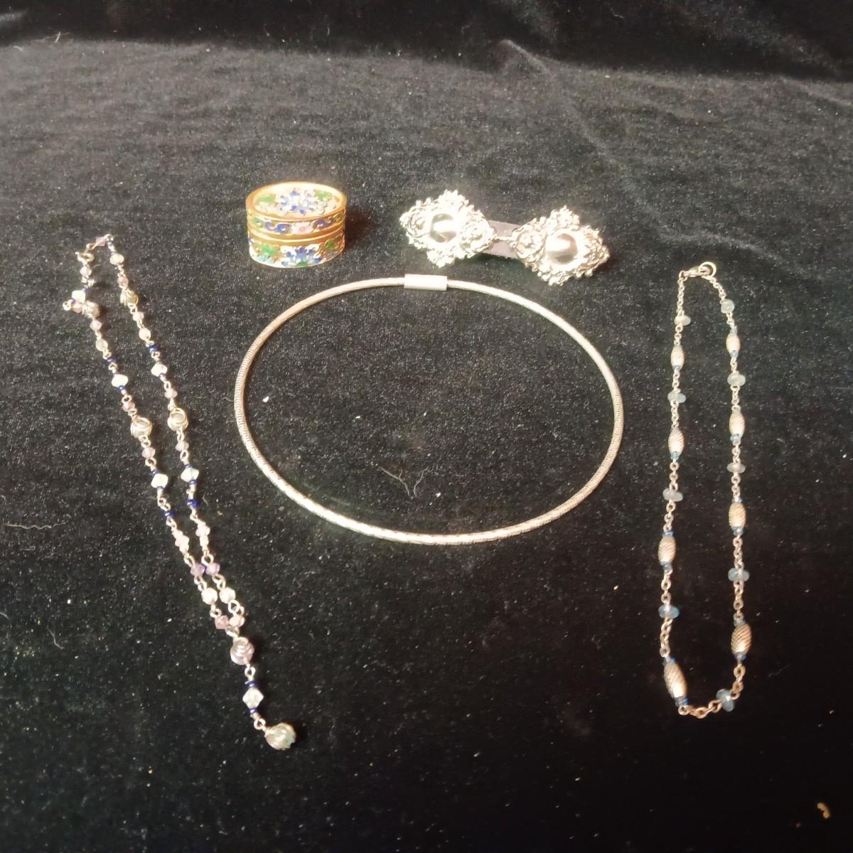 3 NECKLACES, BRASS PILL HOLDER AND DOUBLE PIN
