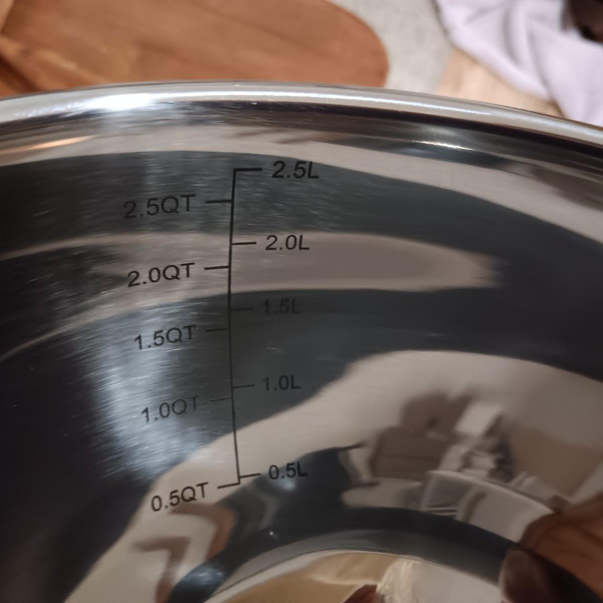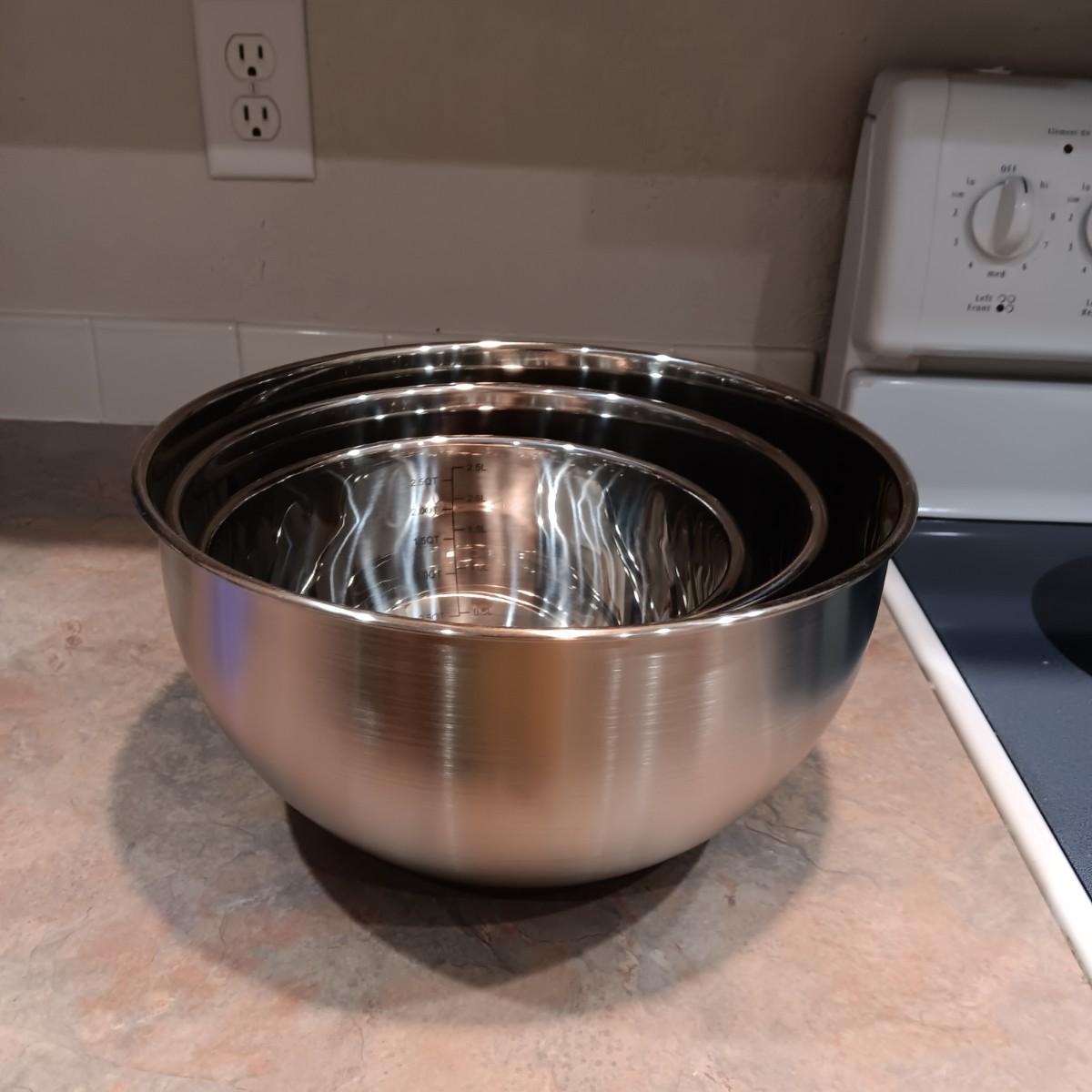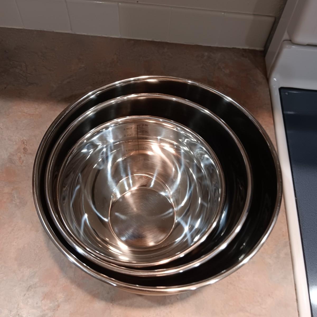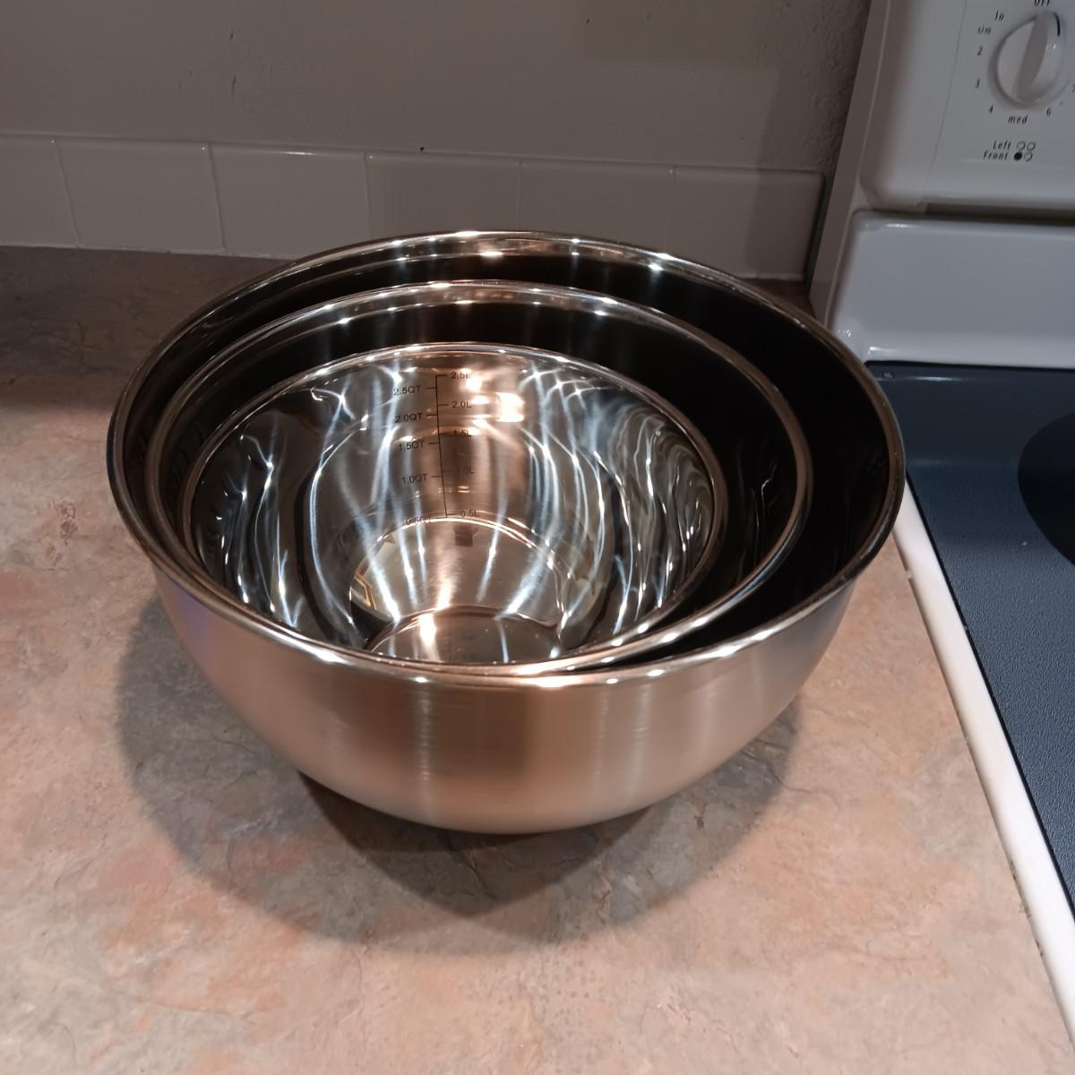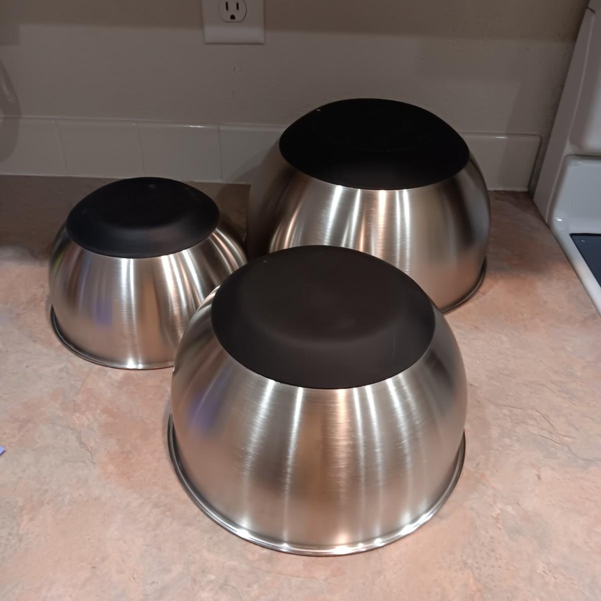 3 NESTING STAINLESS STEEL BOWLS W/RUBBER BOTTOMS AND MEASUREMENTS INSIDE THE BOWLS