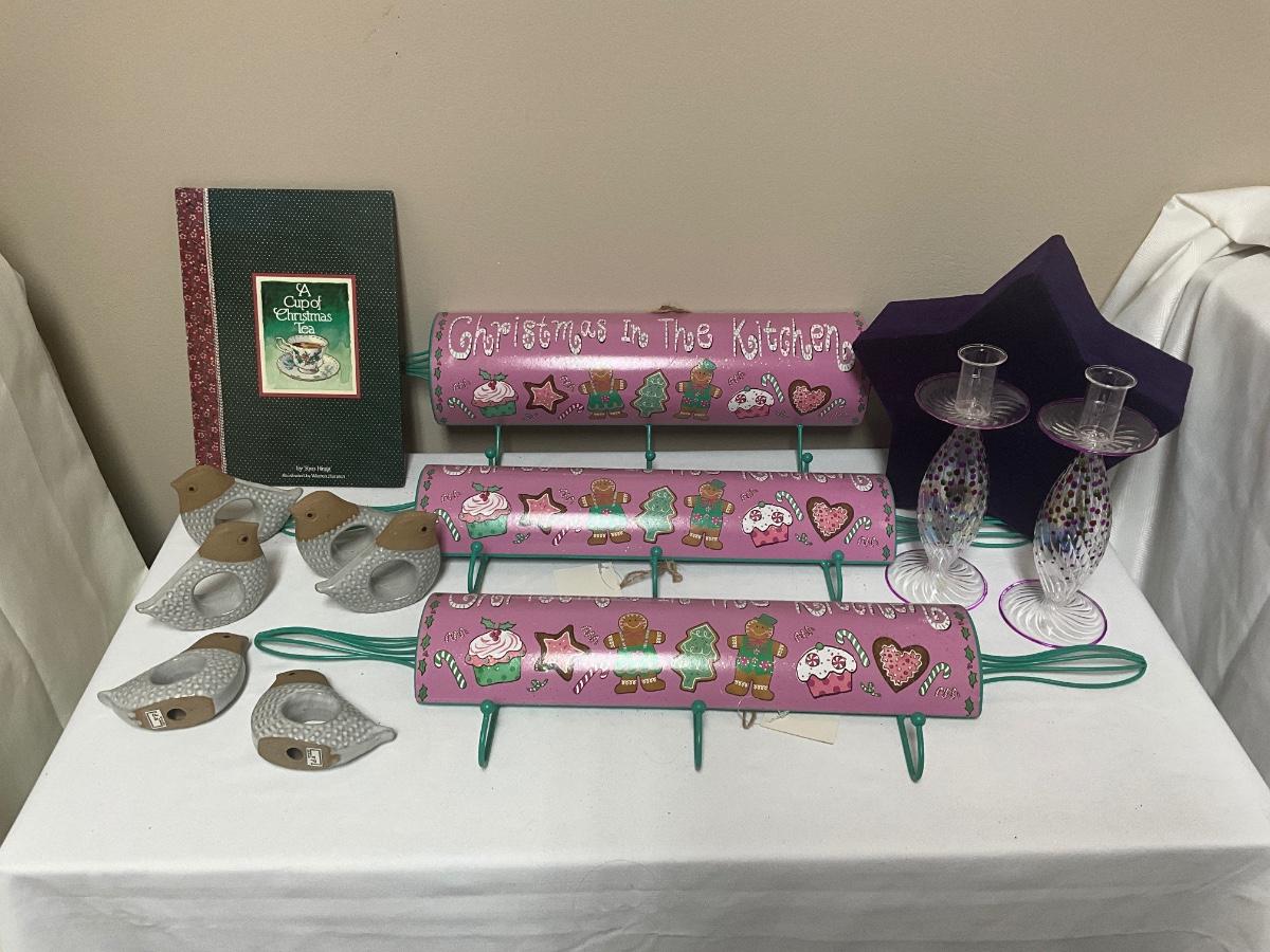 3 new Christmas in the Kitchen hooks, 6 Japanese bird napkin holders, 2 candle sticks, velvet star box and Christmas Book