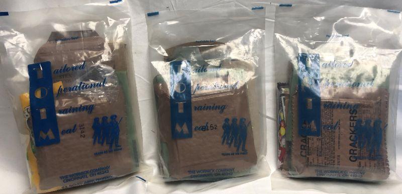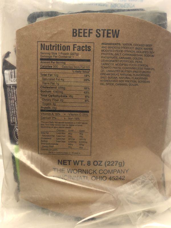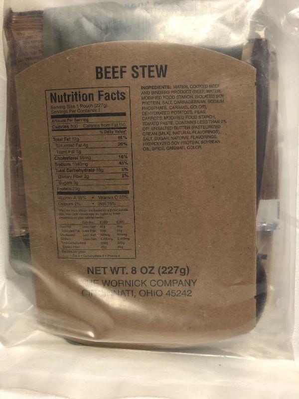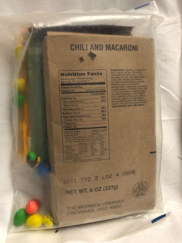 Beef Stew (x2) & Chili/Mac (M&M's Opened Up)ALL items in lot have NEVER been opened or used. They are NEW in original packaging. M&M Candy in one MRE has opened as pictured). Item(s) are Sold as is - Photo's are part of the Description - Shipping is available or Pickup by Appointment