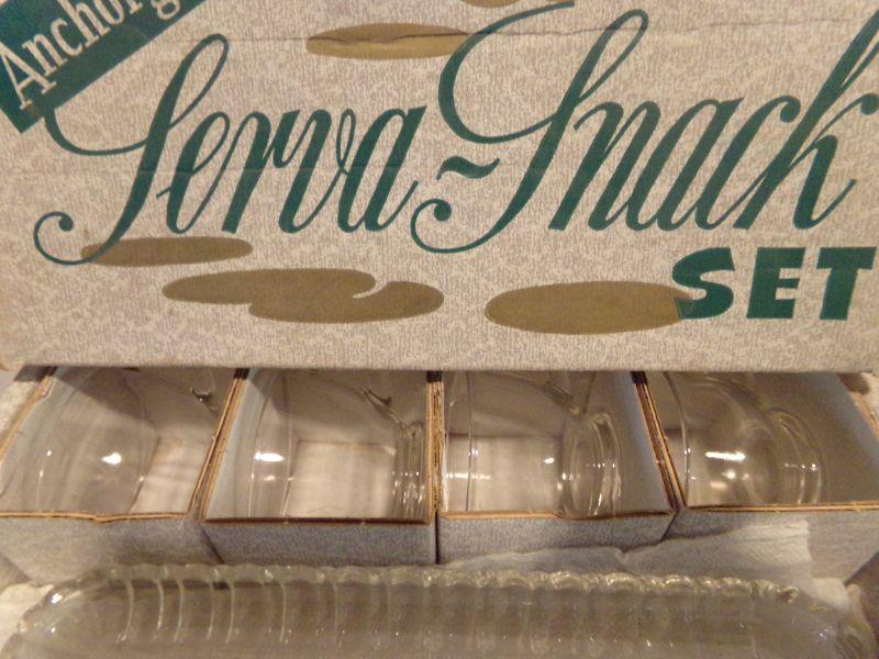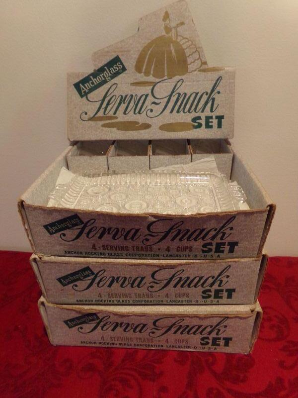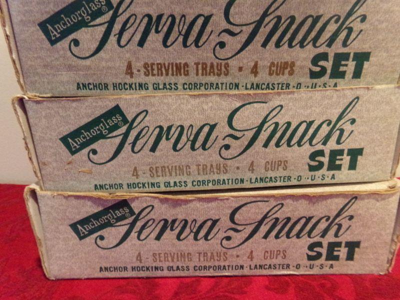 3 BOXES OF ANCHOR GLASS SERVA-SNACK SETS. EACH BOX CONTAINS 4 CUPS AND 4 SERVING TRAYS.