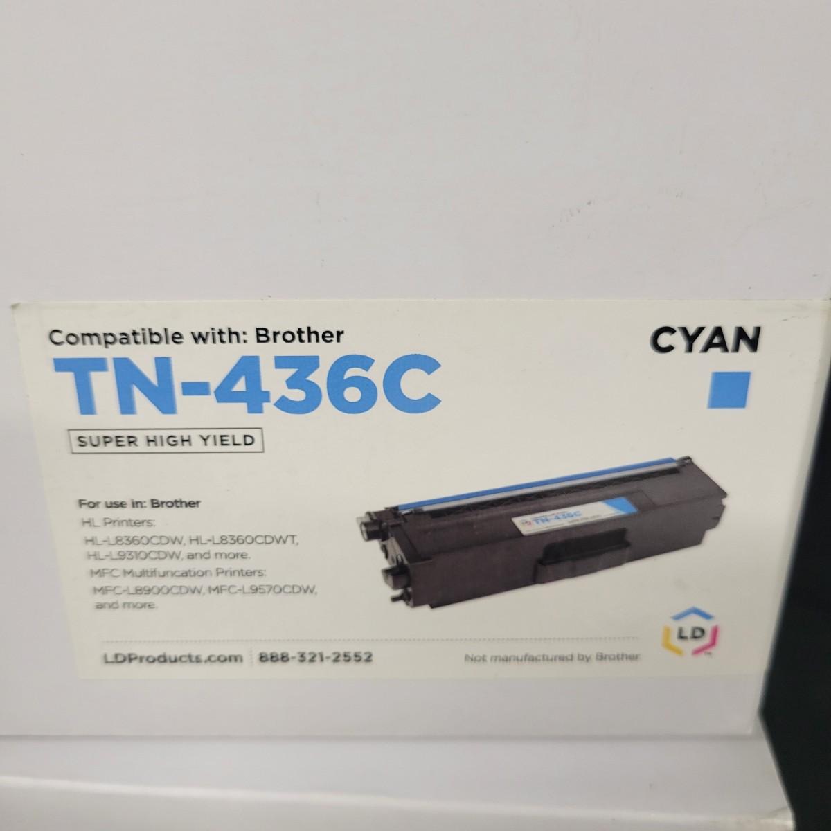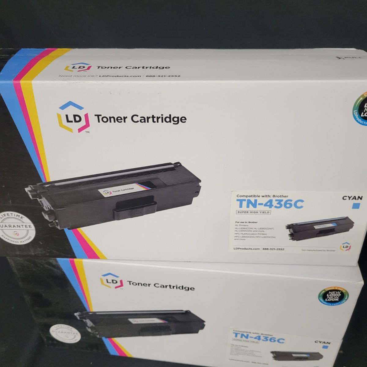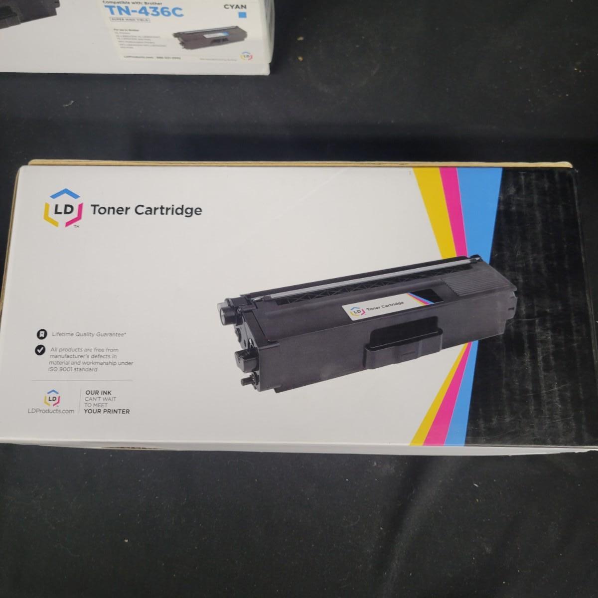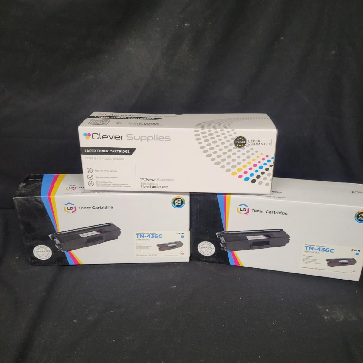 3 new in box toner cartridges that are compatible with a variety of Brother laser printers. 1 box is manufactured by Clever Supplies and is a black cartridge. The other 2 are manufactured by LD Products and are cyan. Shipping available