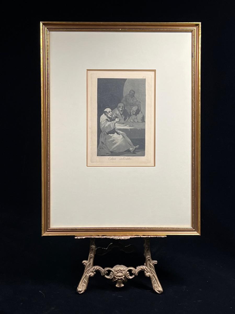 DESCRIPTION: The subject item is an original character etching posing three aging monks seated at a table with a forth standing and serving hot (Estan Calientes) food with the title indicating as such.