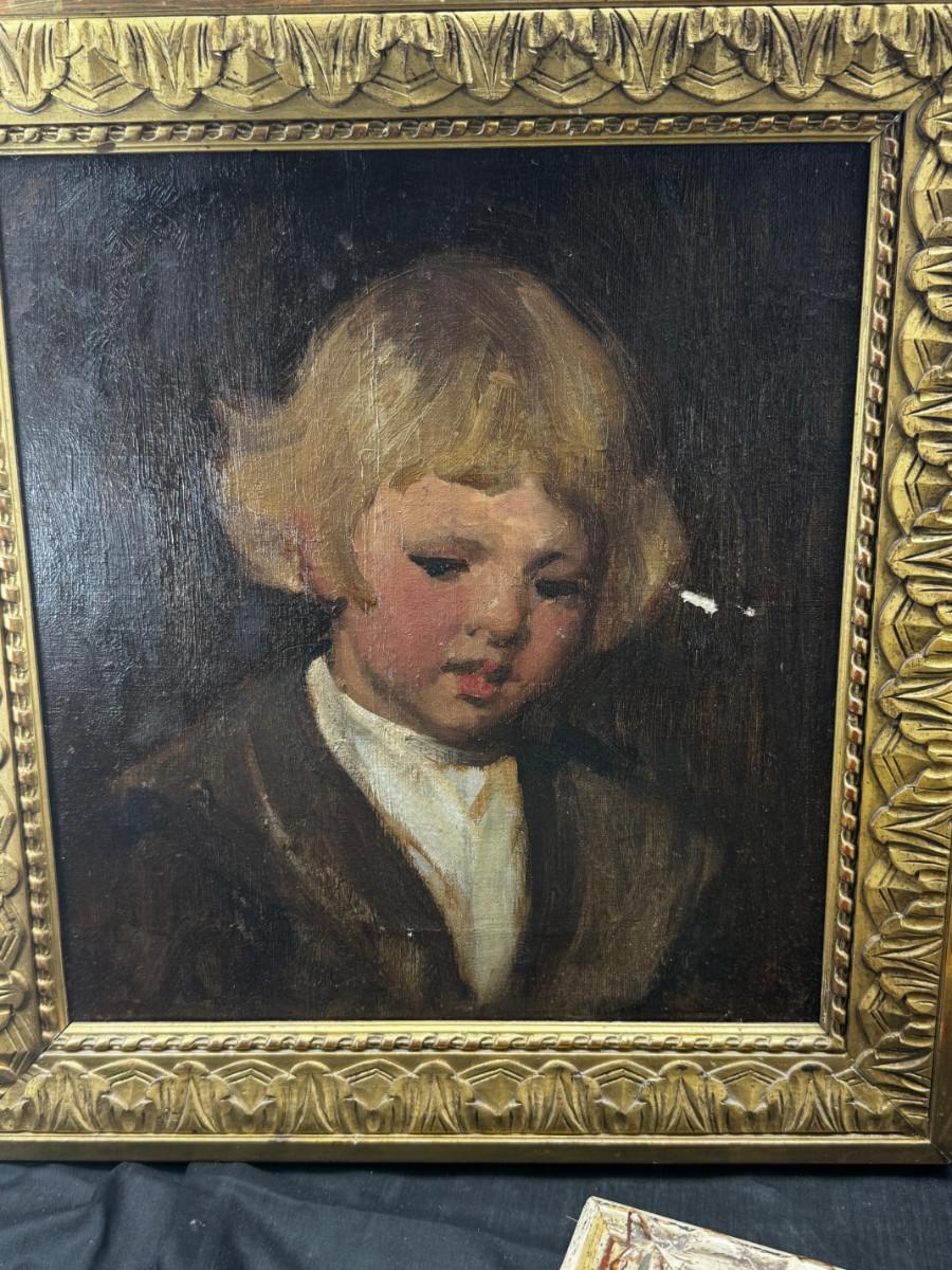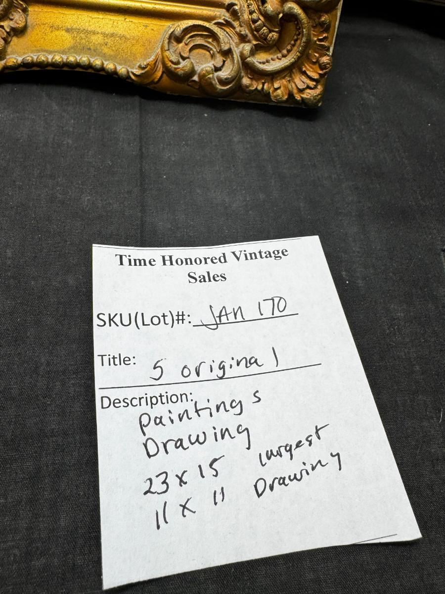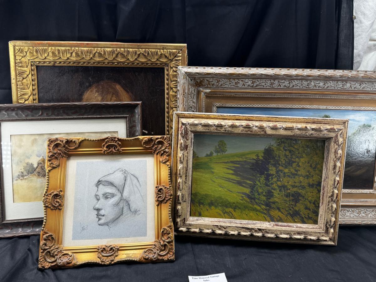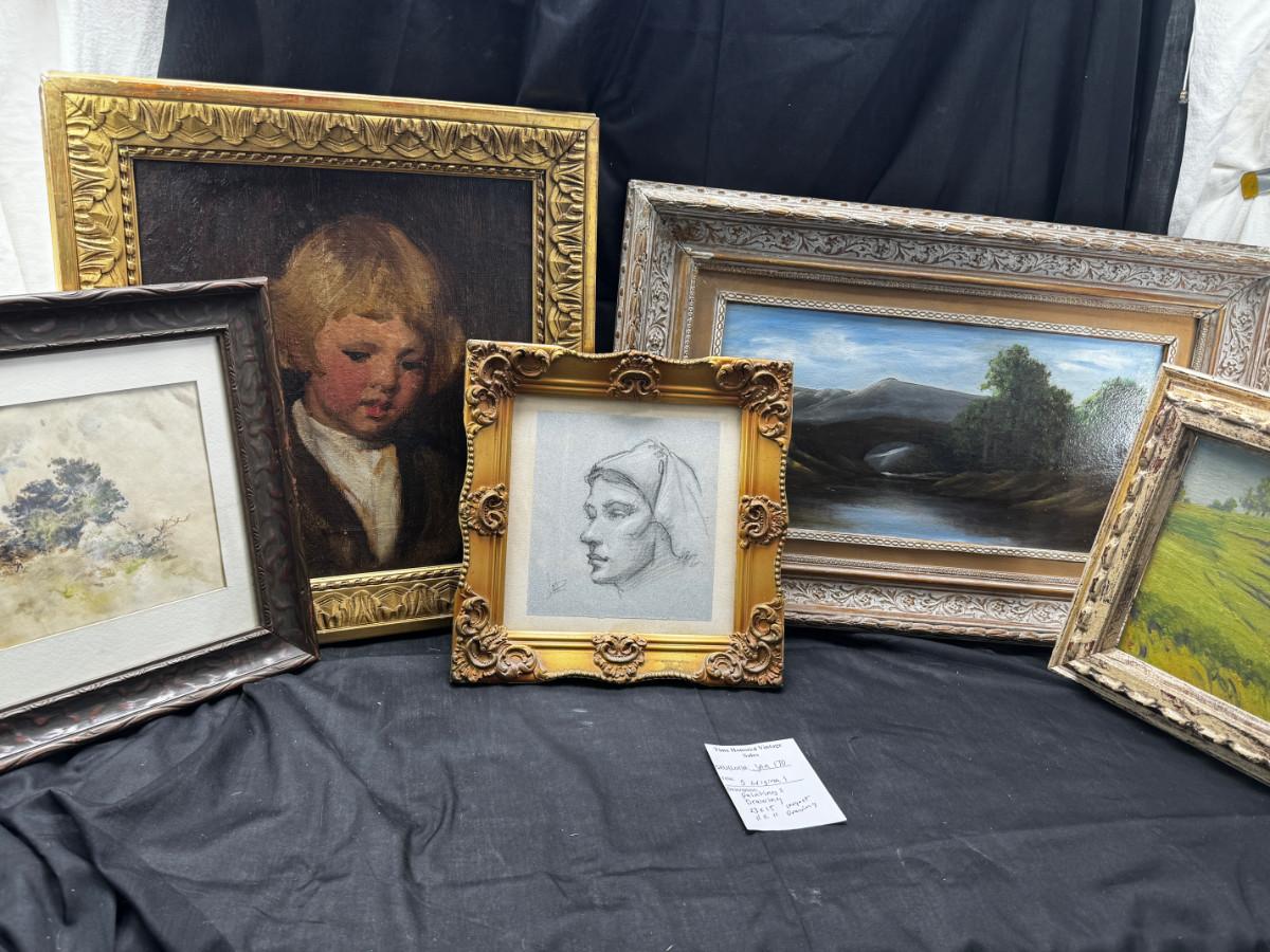 3 antique paintings and 1 original signed sketch drawing. Child's portrait has provenance on back, Caroline Rixford, who studied under James McNeil Whistler from San Francisco. There is an area of damage. The gorgeous original frames have wear.