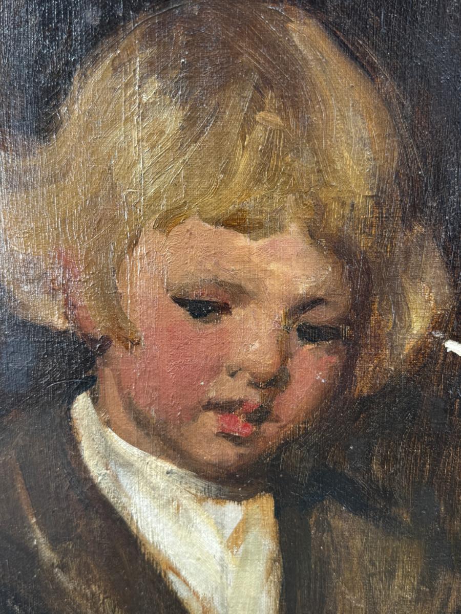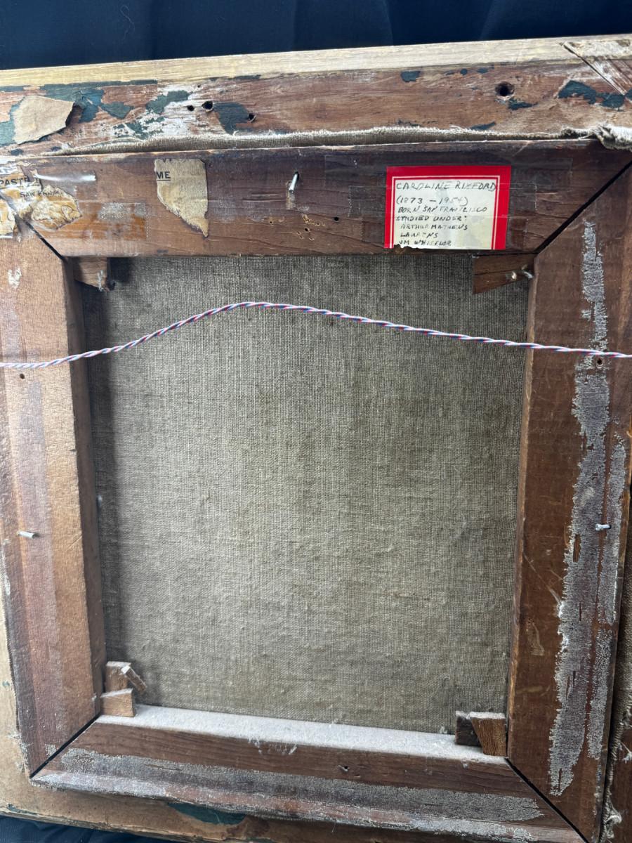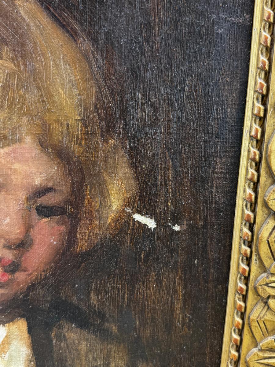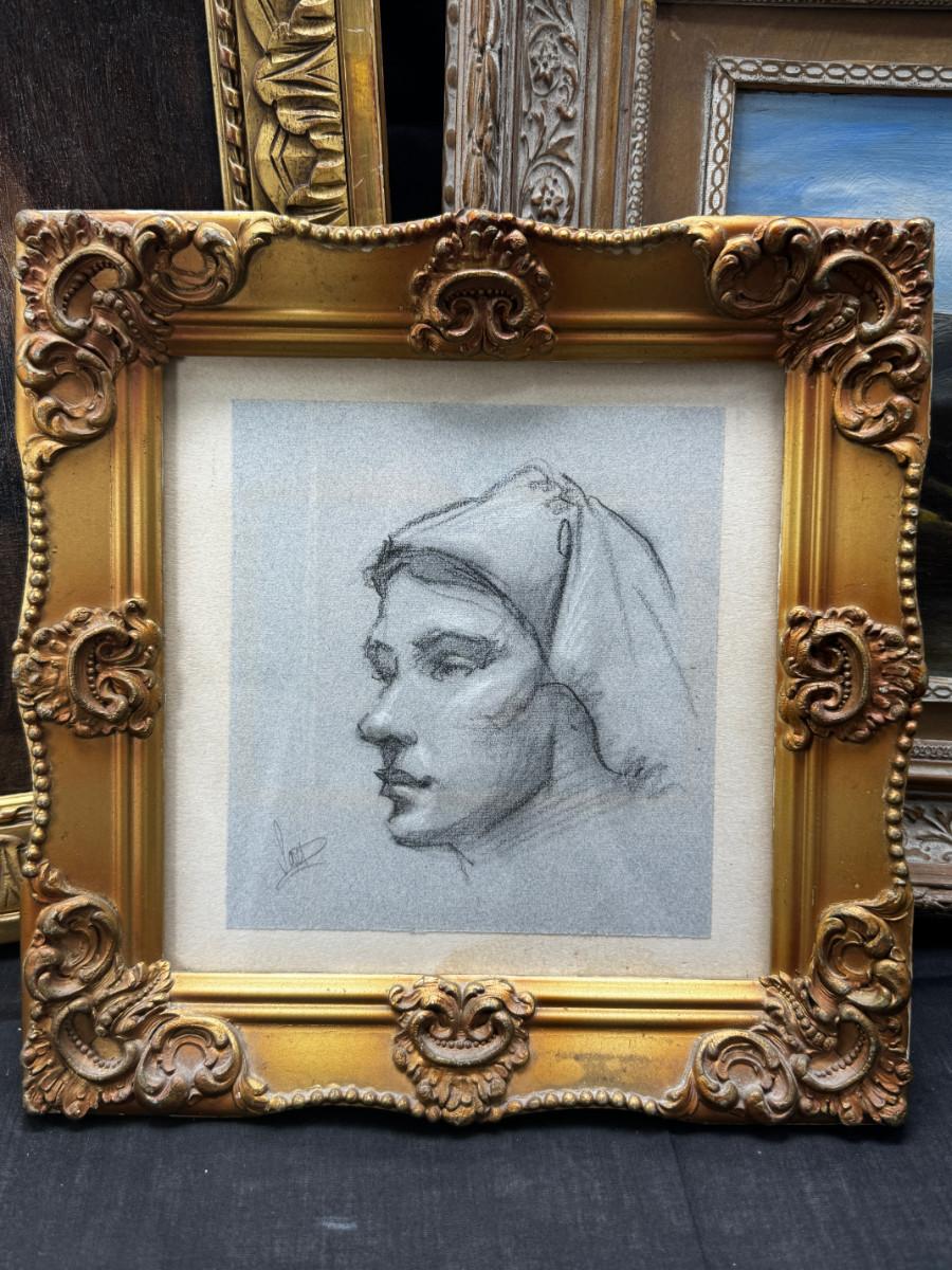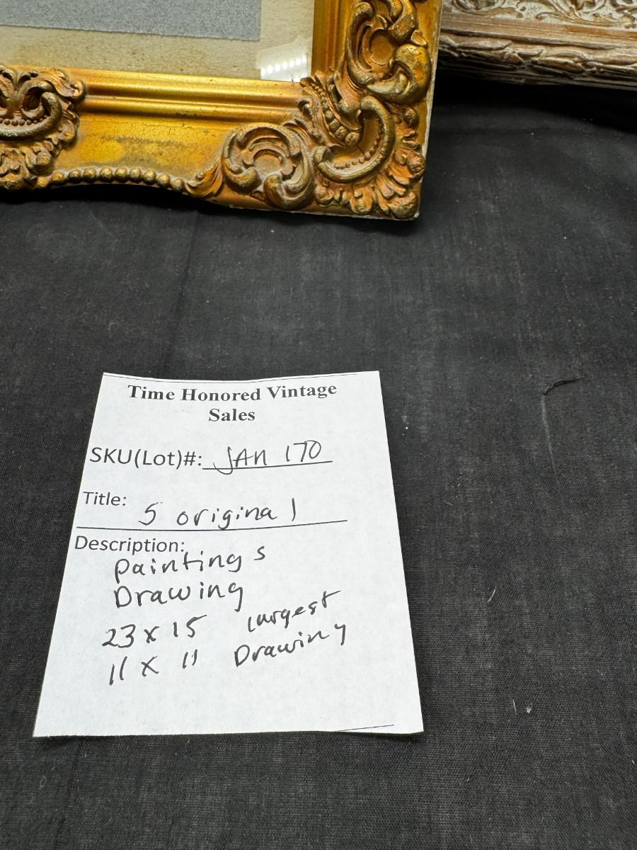 3 antique paintings and 1 original signed sketch drawing. Child's portrait has provenance on back, Caroline Rixford, who studied under James McNeil Whistler from San Francisco. There is an area of damage. The gorgeous original frames have wear.