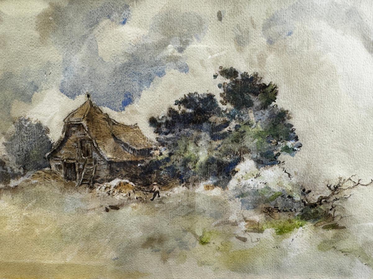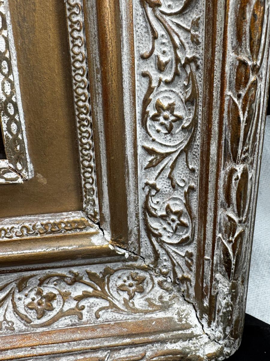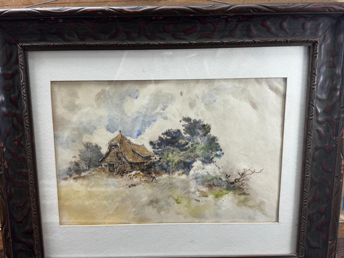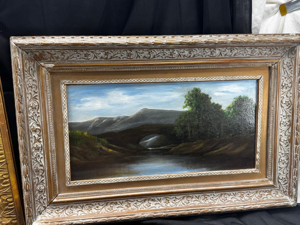 3 antique paintings and 1 original signed sketch drawing. Child's portrait has provenance on back, Caroline Rixford, who studied under James McNeil Whistler from San Francisco. There is an area of damage. The gorgeous original frames have wear.