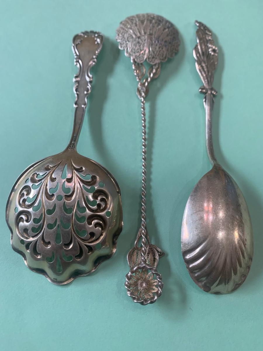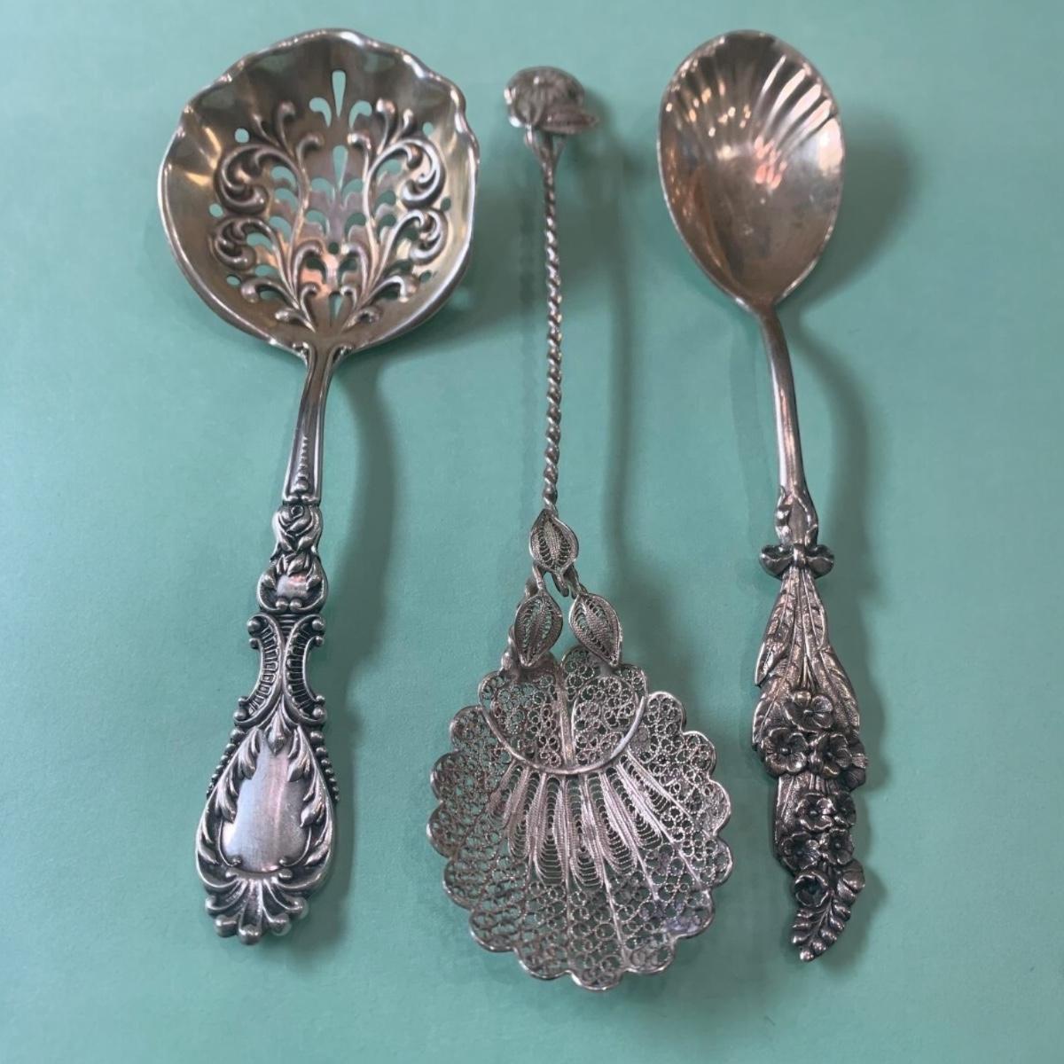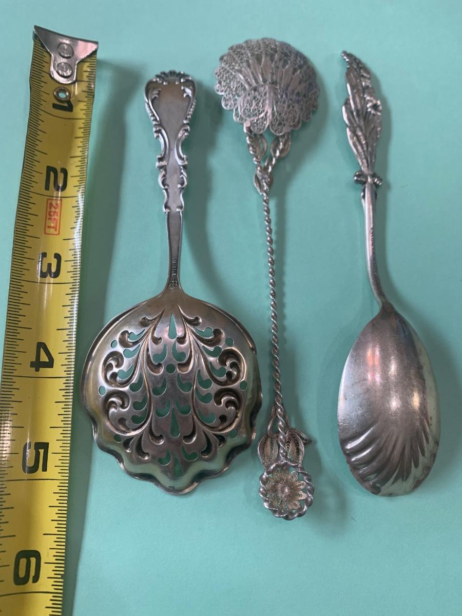3 Ornate Filigree Sterling Silver Tomato / Sugar / Serving Spoons