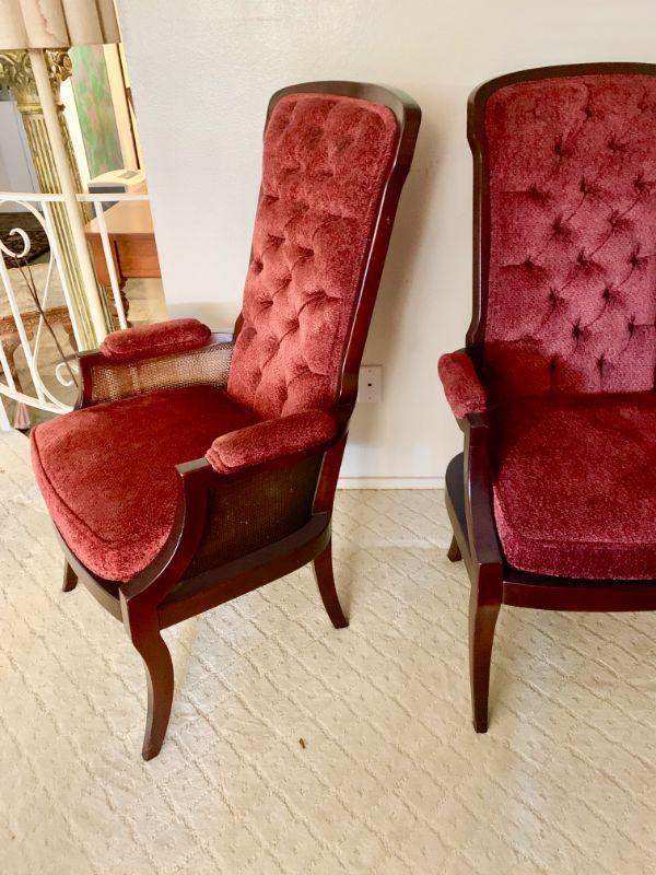 High tufted back, wide seat and arm rests. Burgundy velvet.