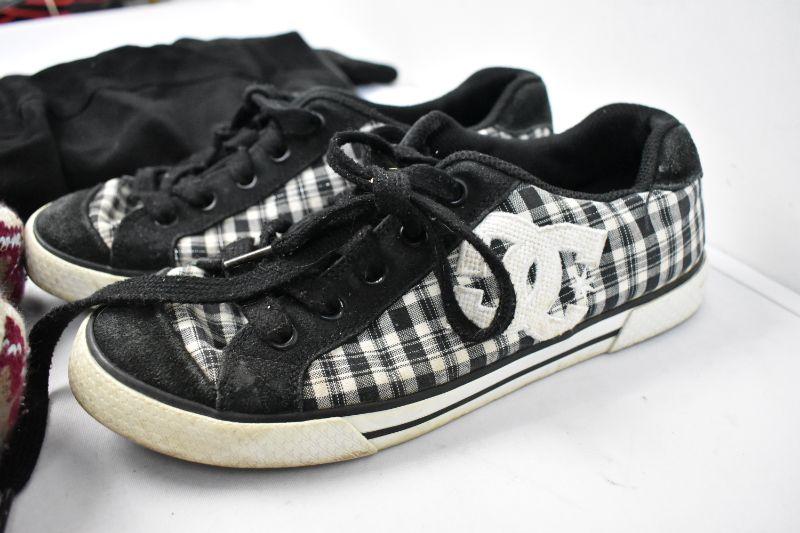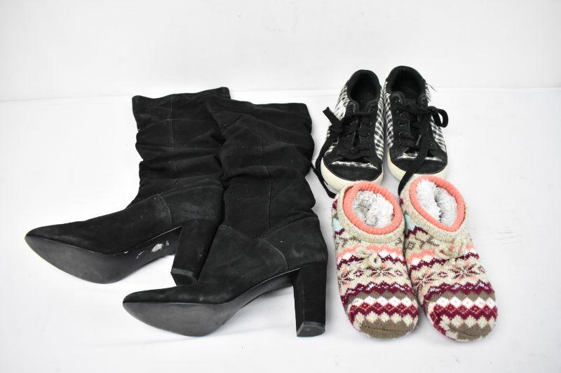 3 Pair Women's Shoes: Black Boots Size 7, DC Tennis Shoes Size 7.5, & Slippers