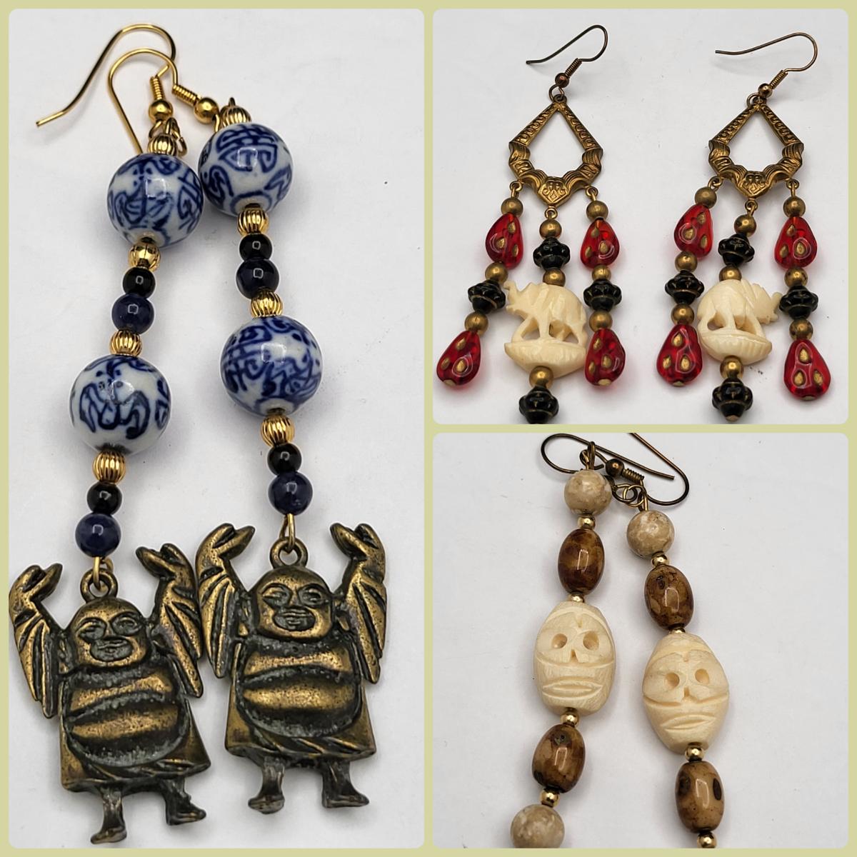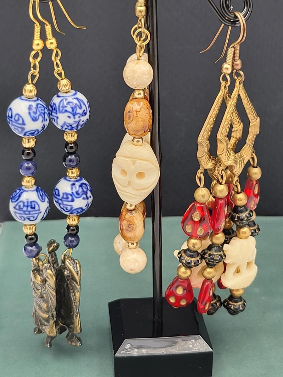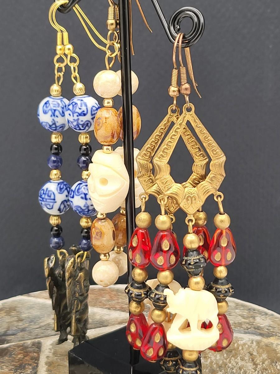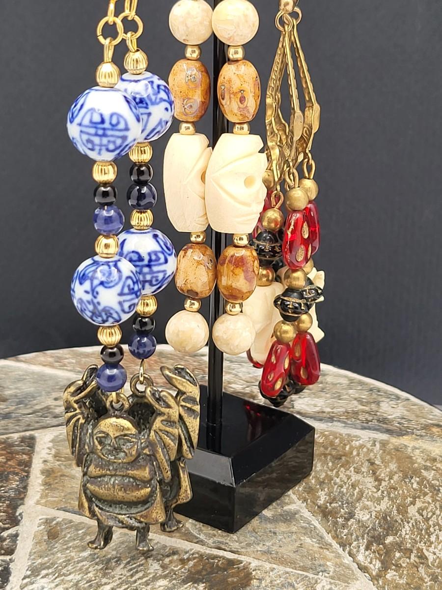 Three pairs pierced earrings, Asian themed, Buddha, elephant, glass and ceramic beads & carved bone. They range from 2.5" to 3" long.