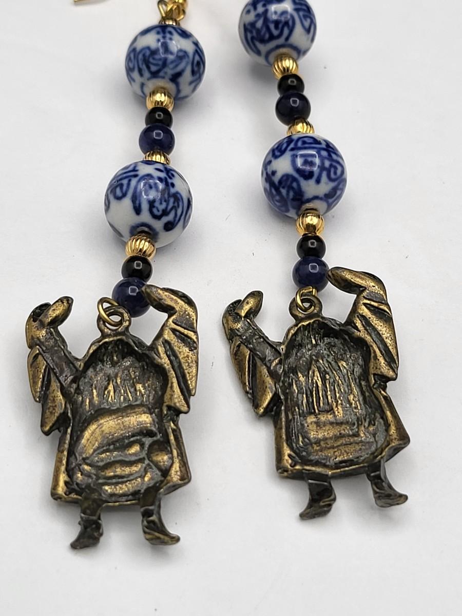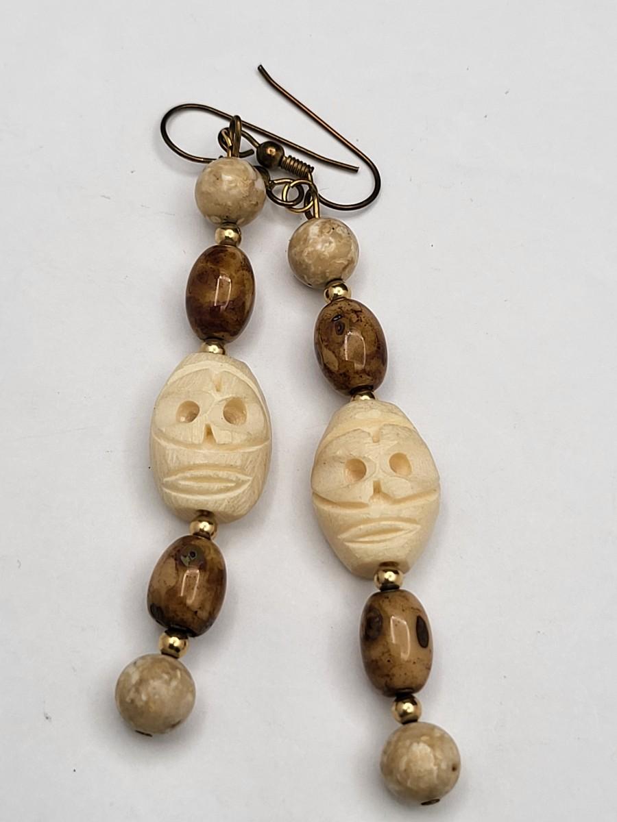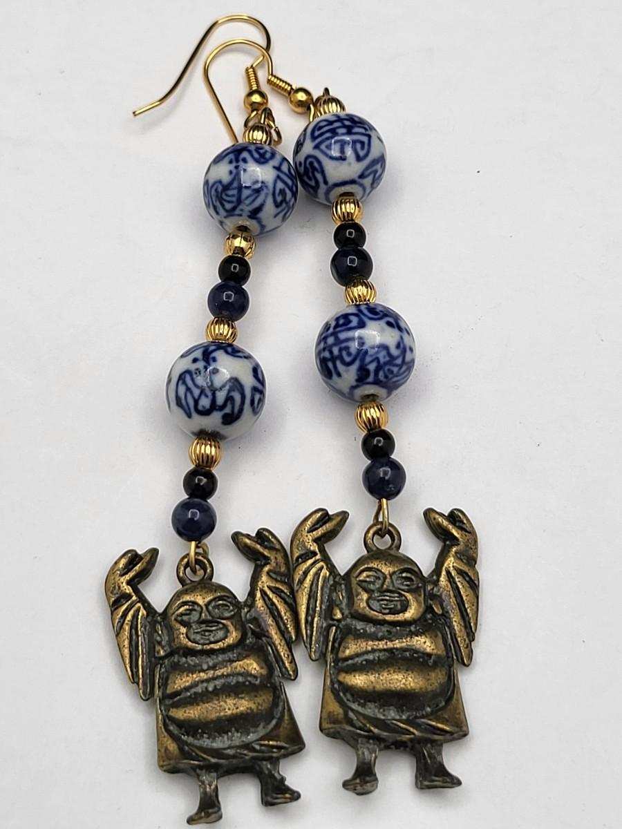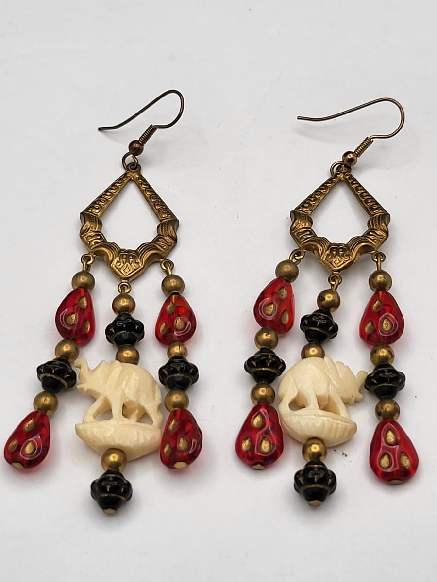 Three pairs pierced earrings, Asian themed, Buddha, elephant, glass and ceramic beads & carved bone. They range from 2.5" to 3" long.