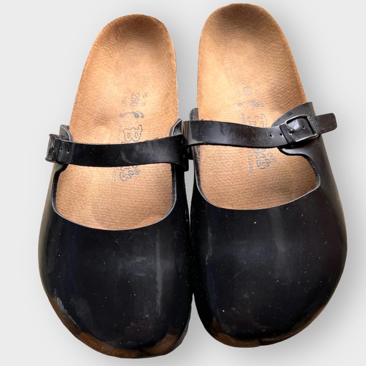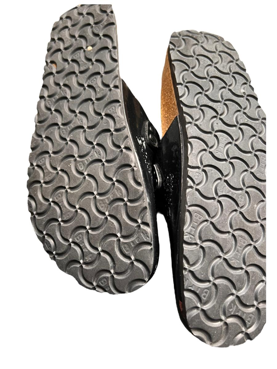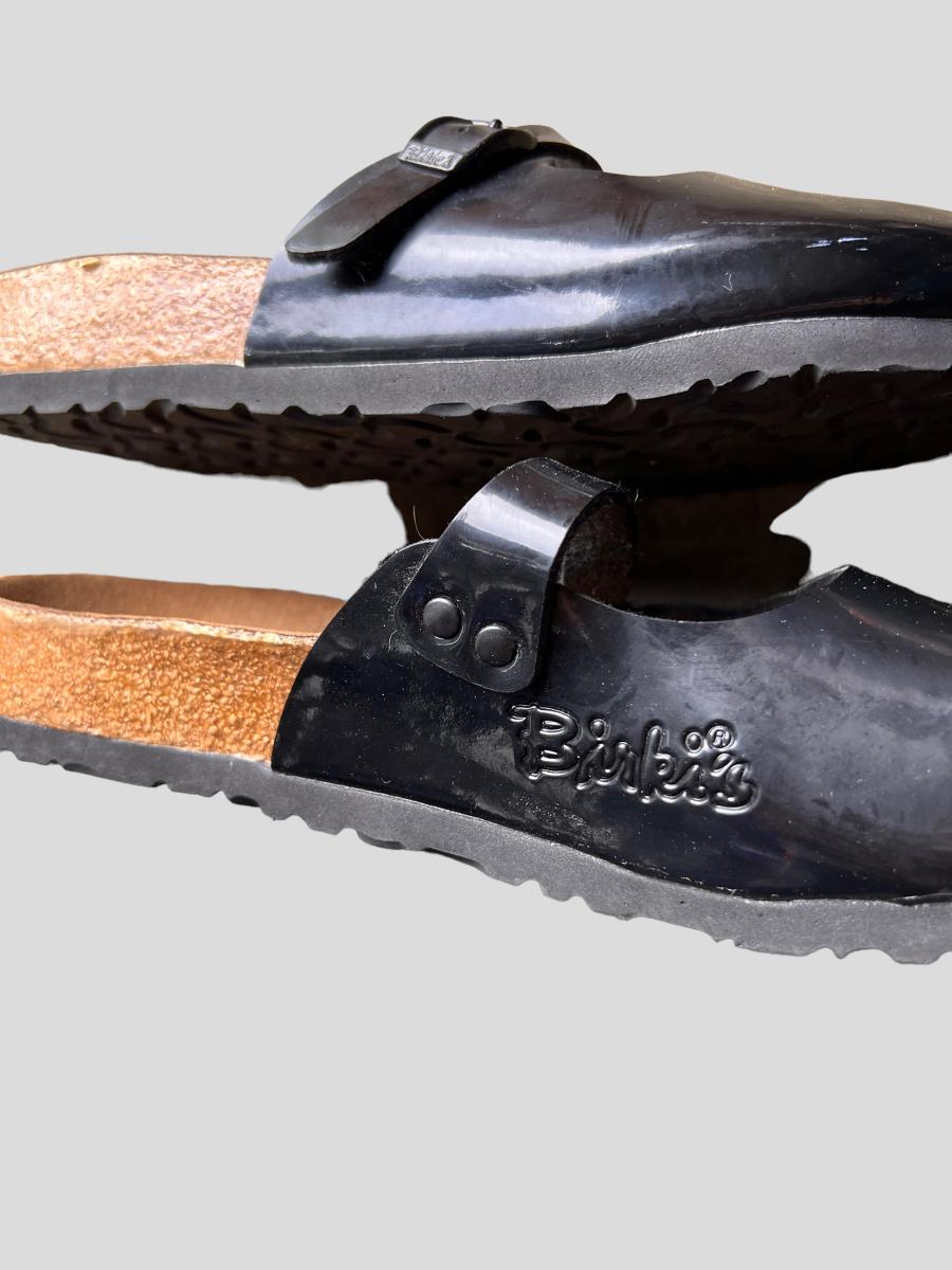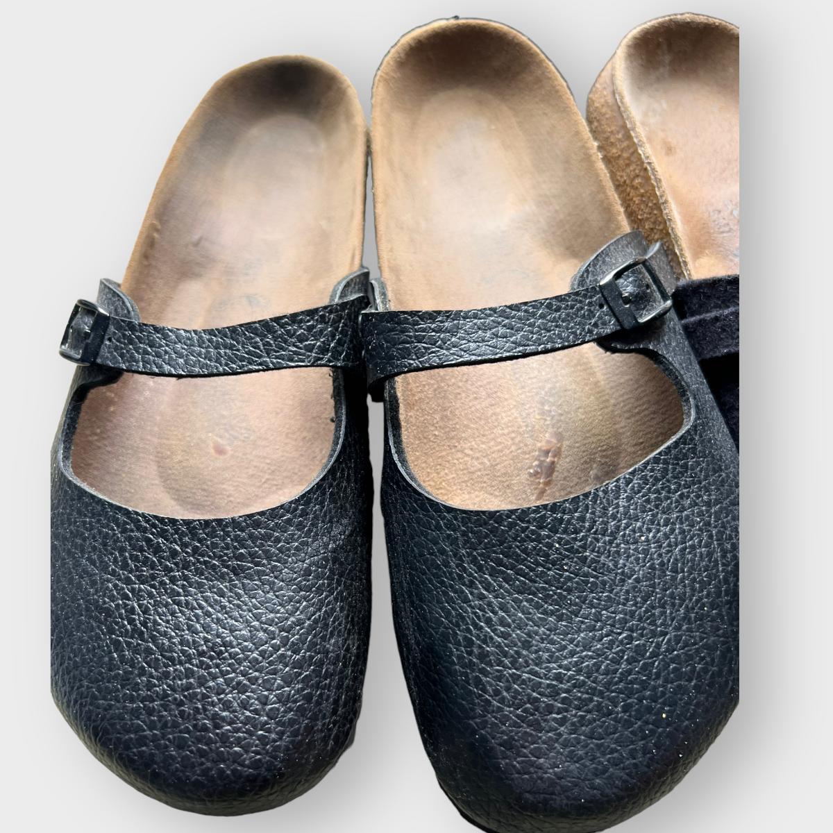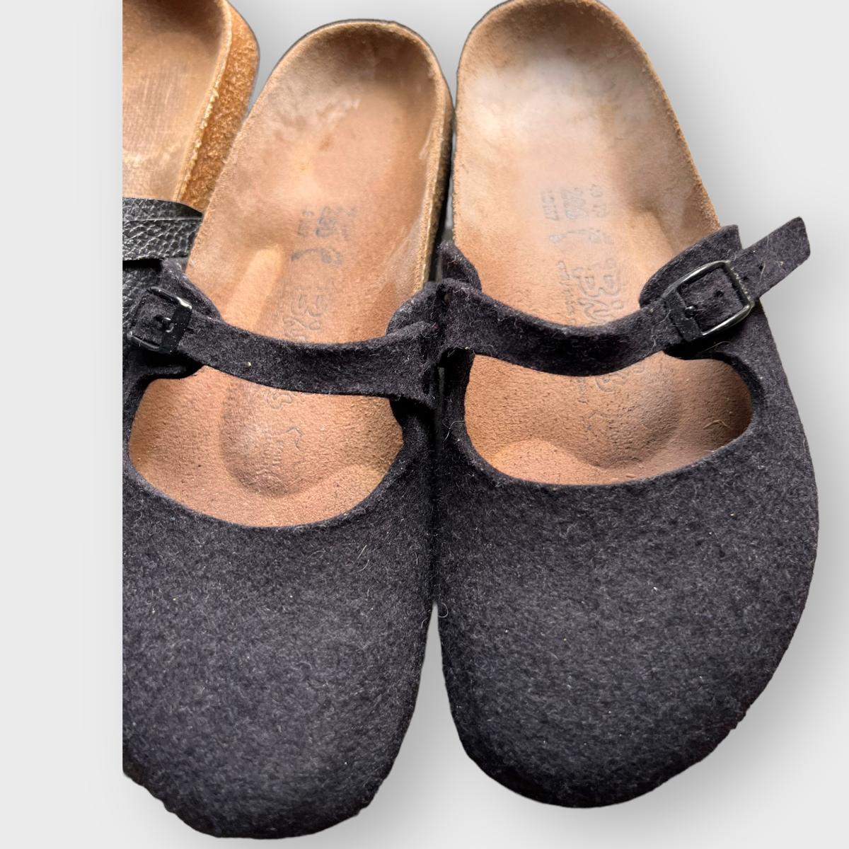 2 pairs of these "Maria" style Birkenstocks are black patent leather. The other pair are black wool. Mary jane style. All are in worn condition. See all pics