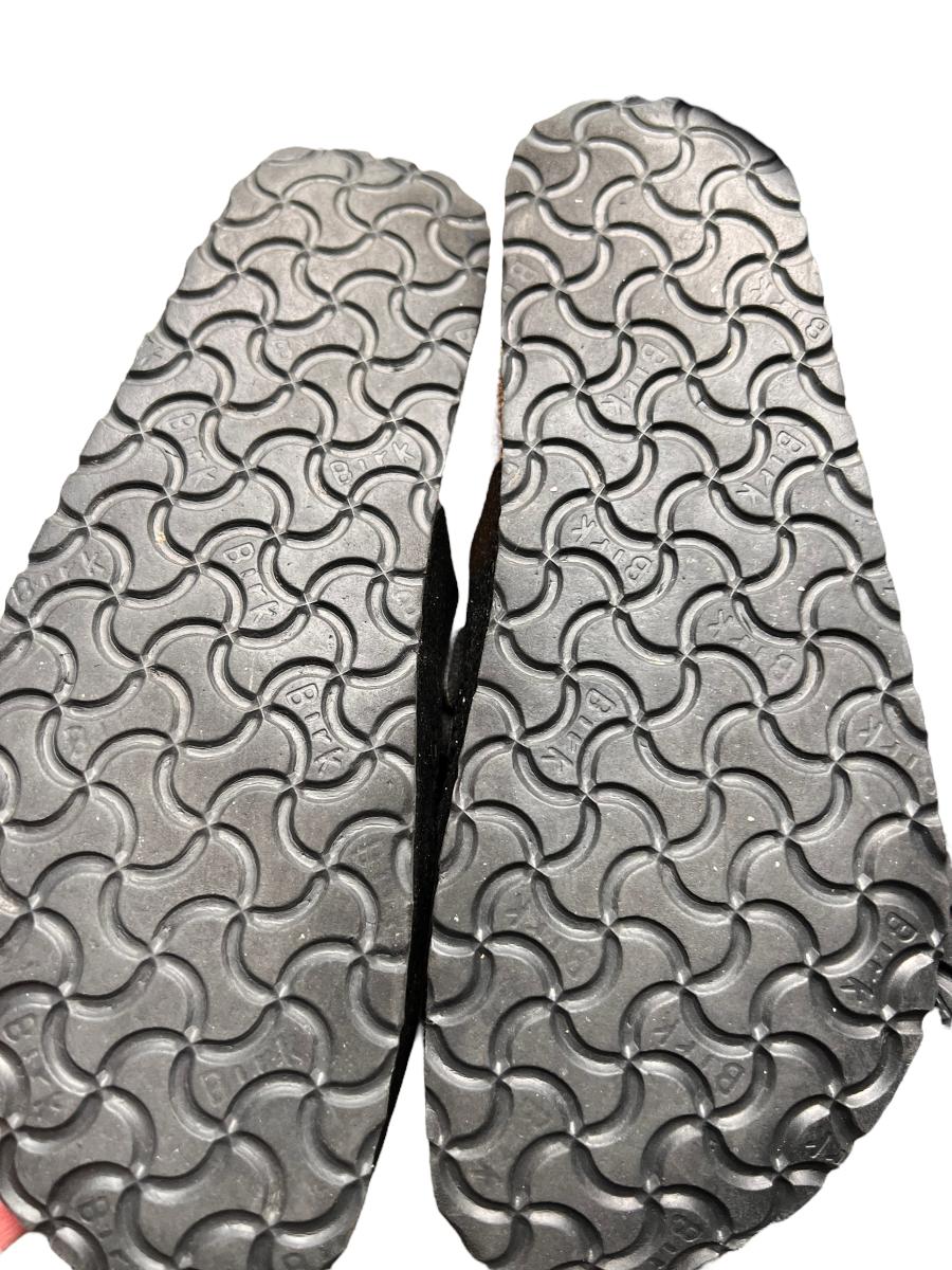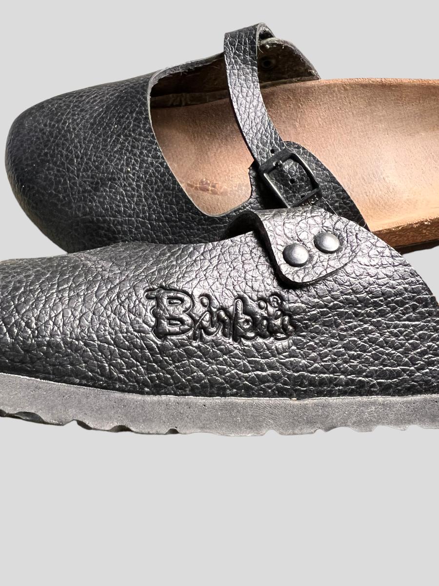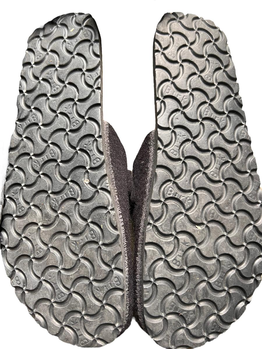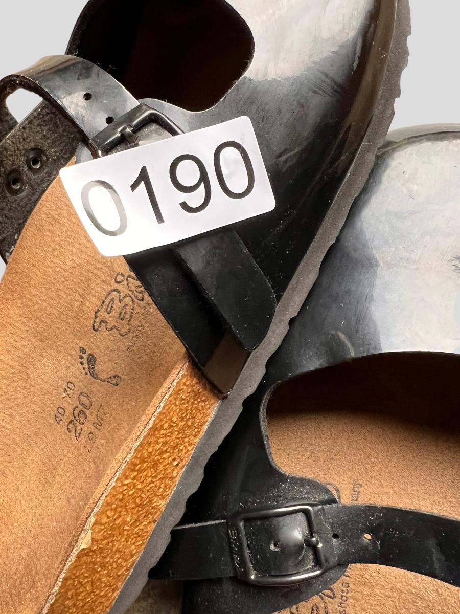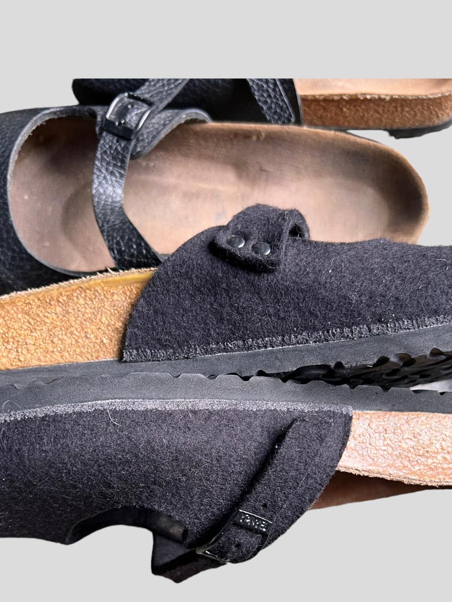 2 pairs of these "Maria" style Birkenstocks are black patent leather. The other pair are black wool. Mary jane style. All are in worn condition. See all pics