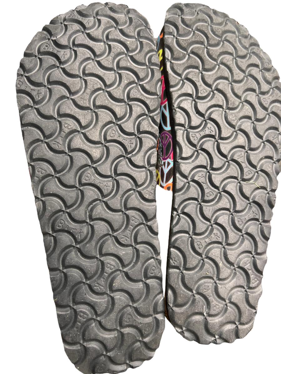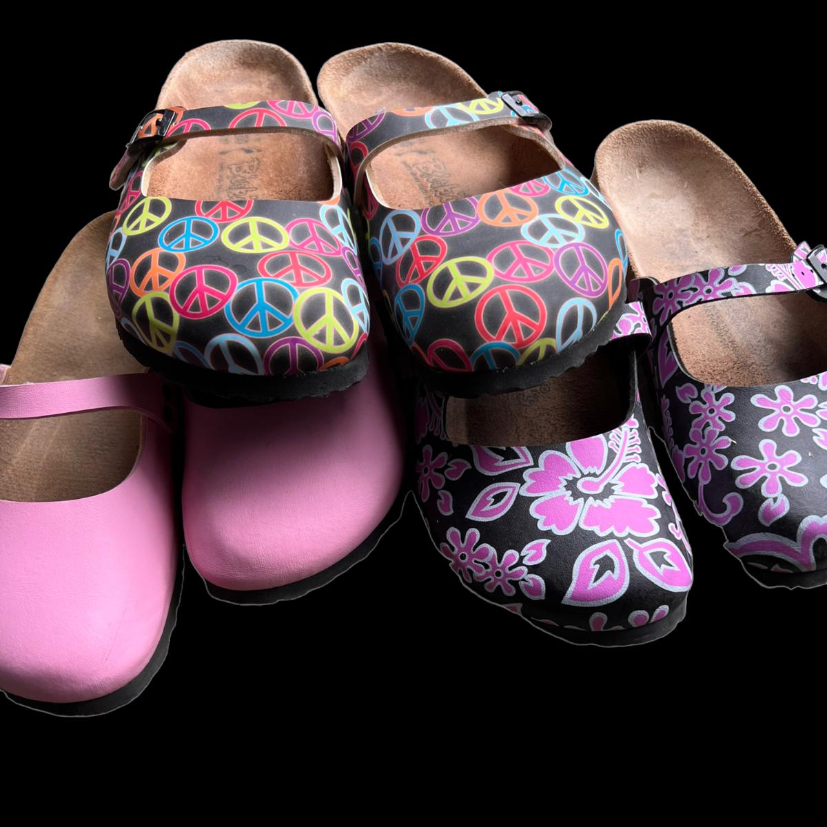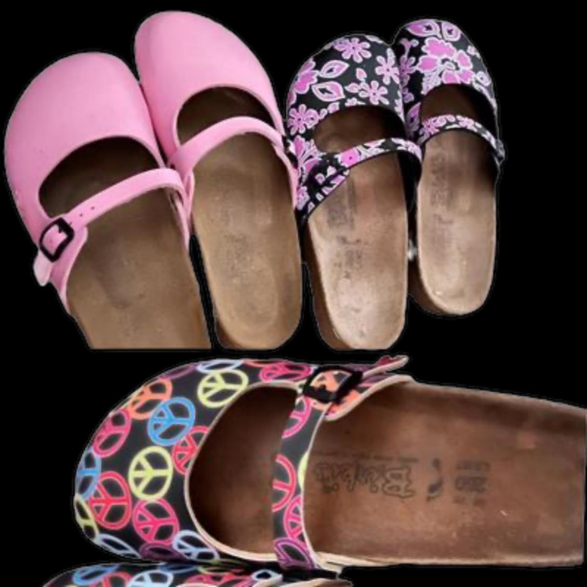 3 pairs of Birki “Maria” closed toe sandals including multicolored peace signs, powder pink, Flor Oahu Aloha Pink Flower Pattern. All have been worn.