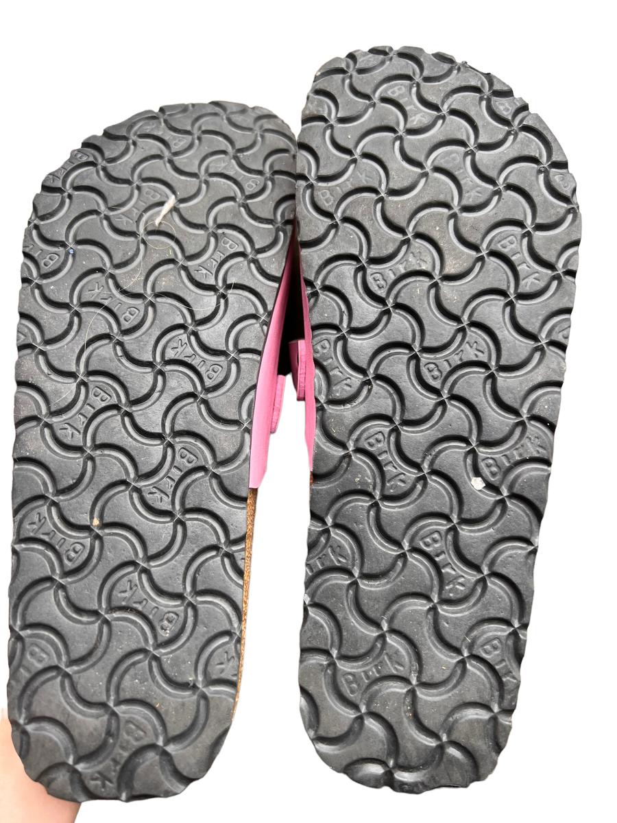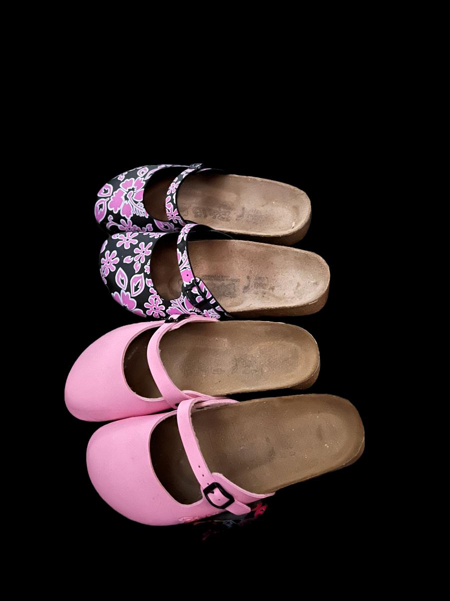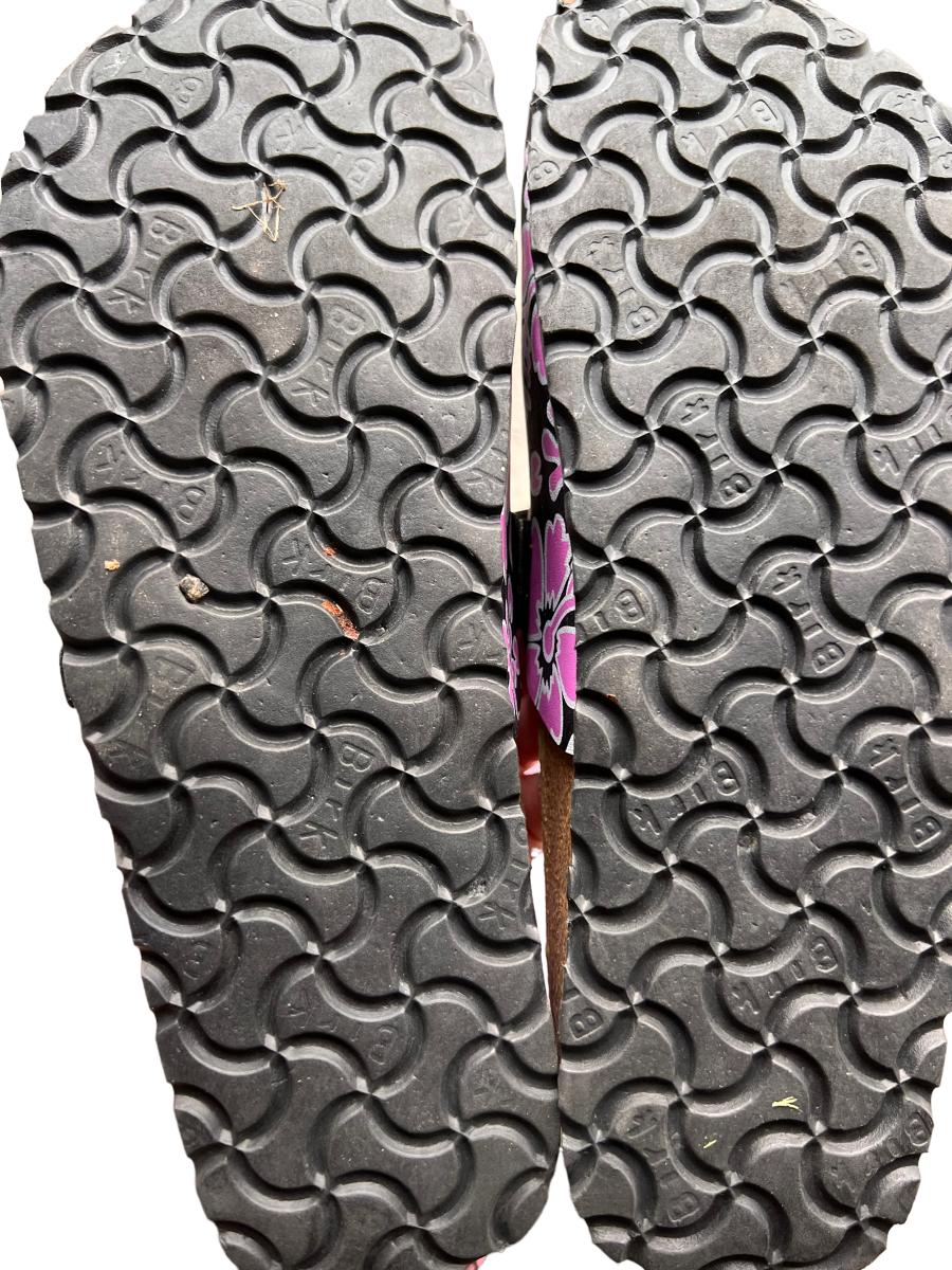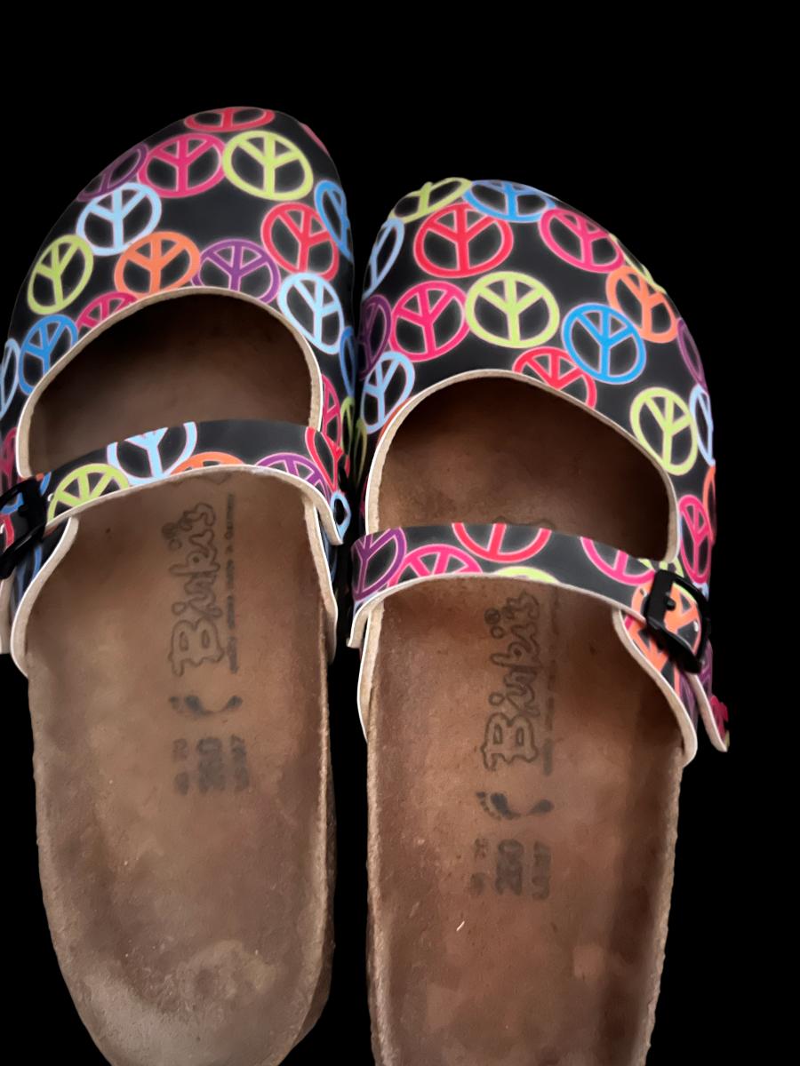 3 pairs of Birki “Maria” closed toe sandals including multicolored peace signs, powder pink, Flor Oahu Aloha Pink Flower Pattern. All have been worn.