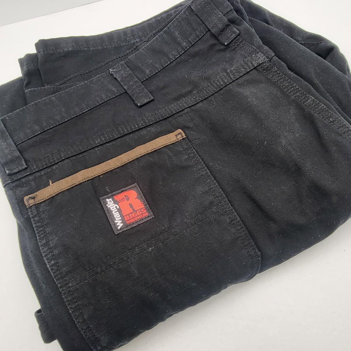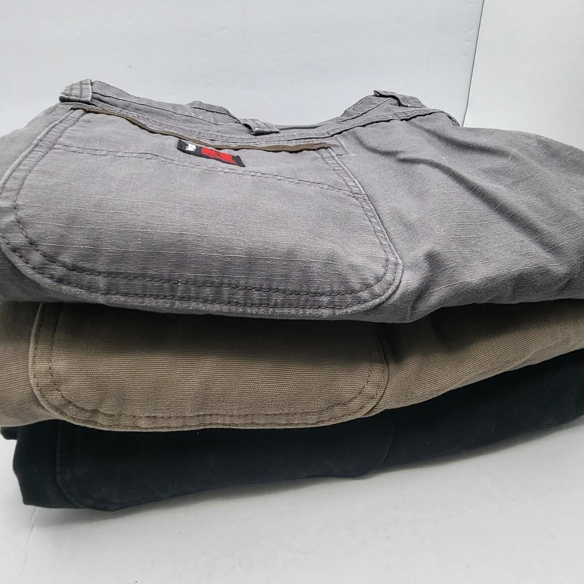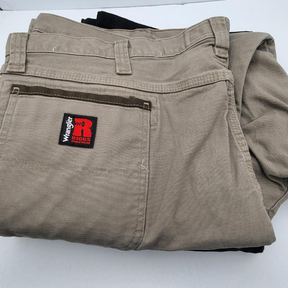 Three pairs, heavy-duty cotton Black, Khaki and grey Wrangler Riggs work pants. Almost new condition. All are size 44 waist x 32 inseam.