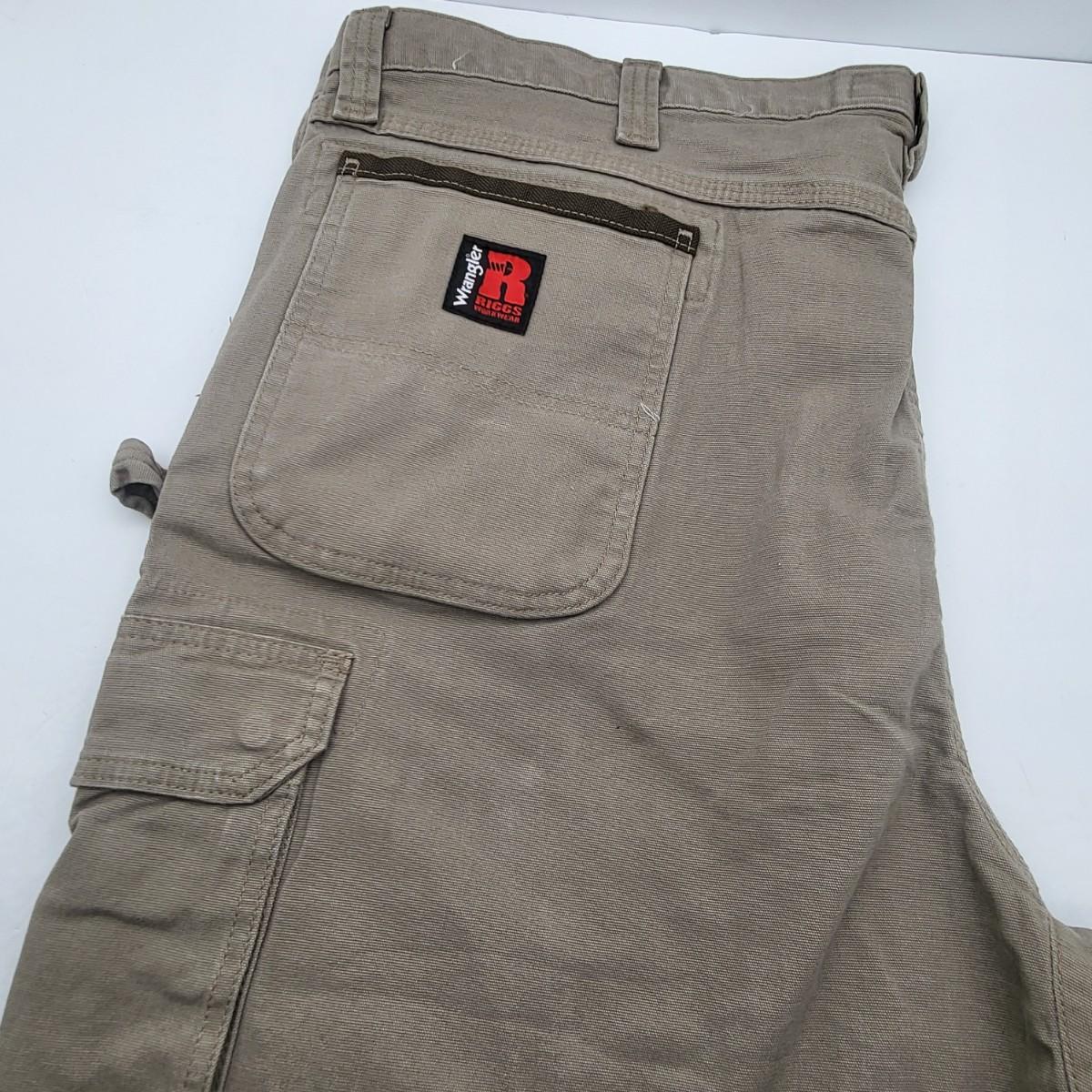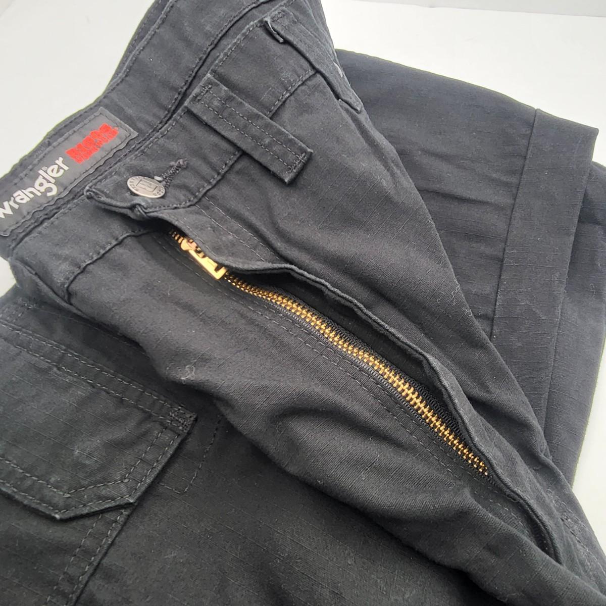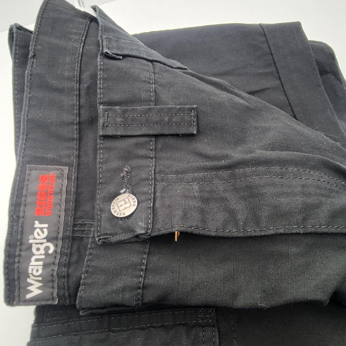 Three pairs, heavy-duty cotton Black, Khaki and grey Wrangler Riggs work pants. Almost new condition. All are size 44 waist x 32 inseam.