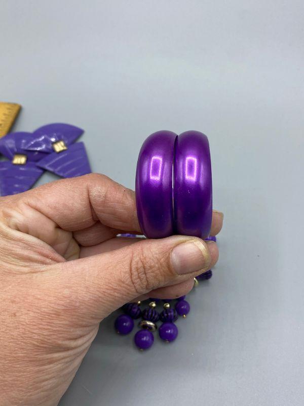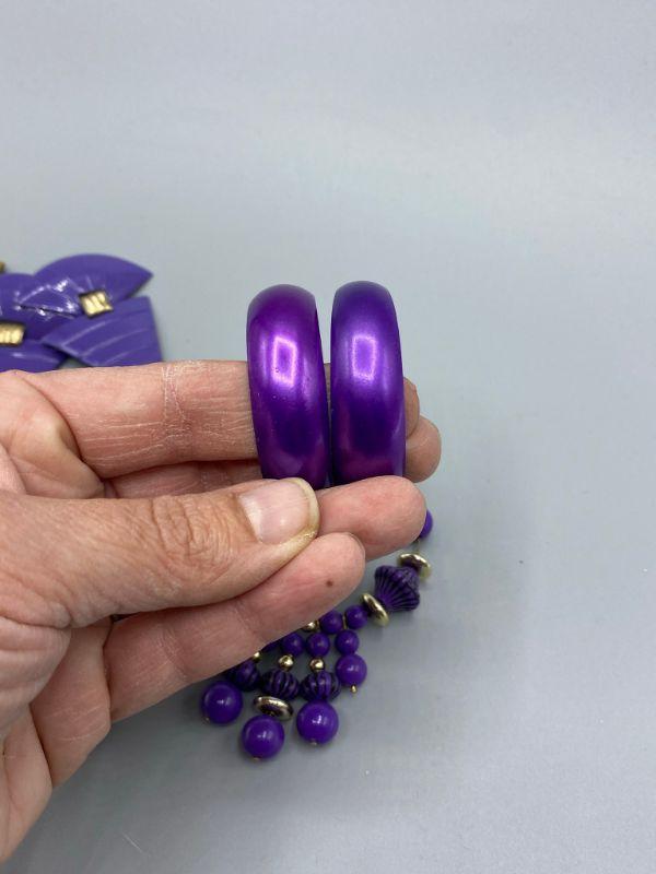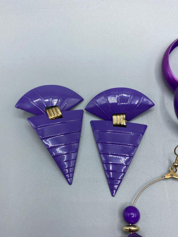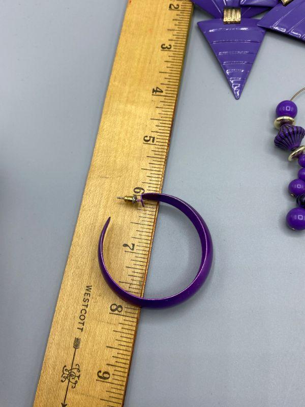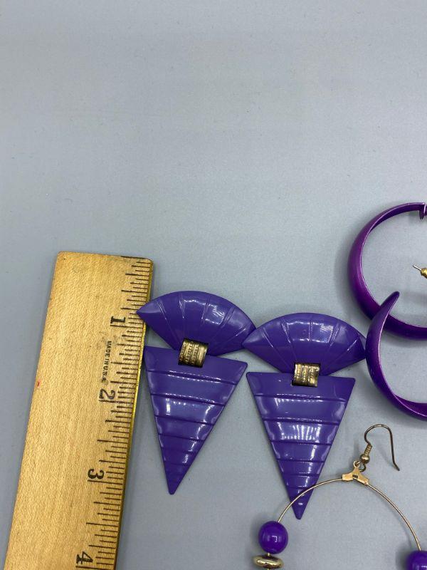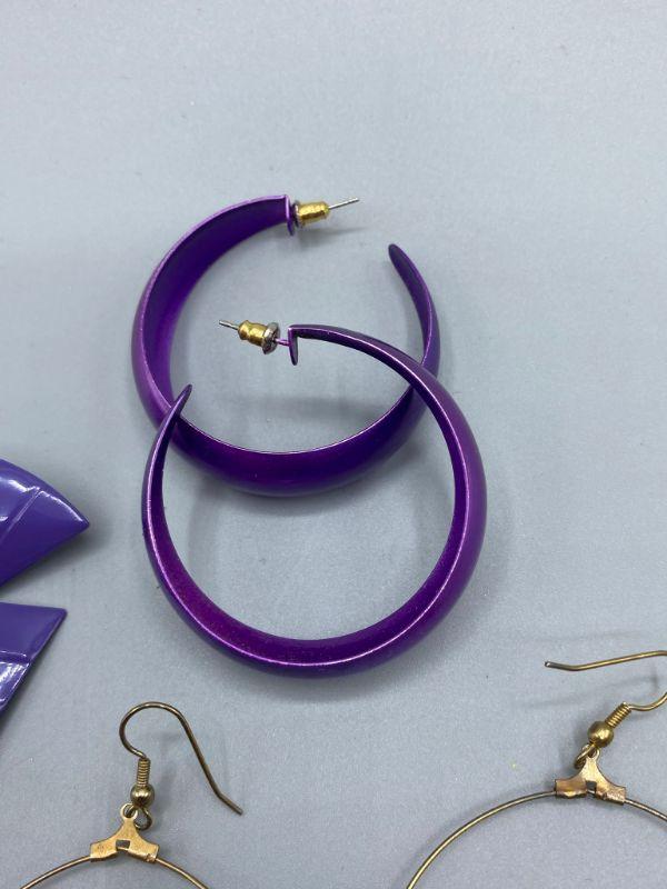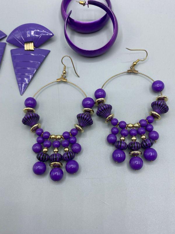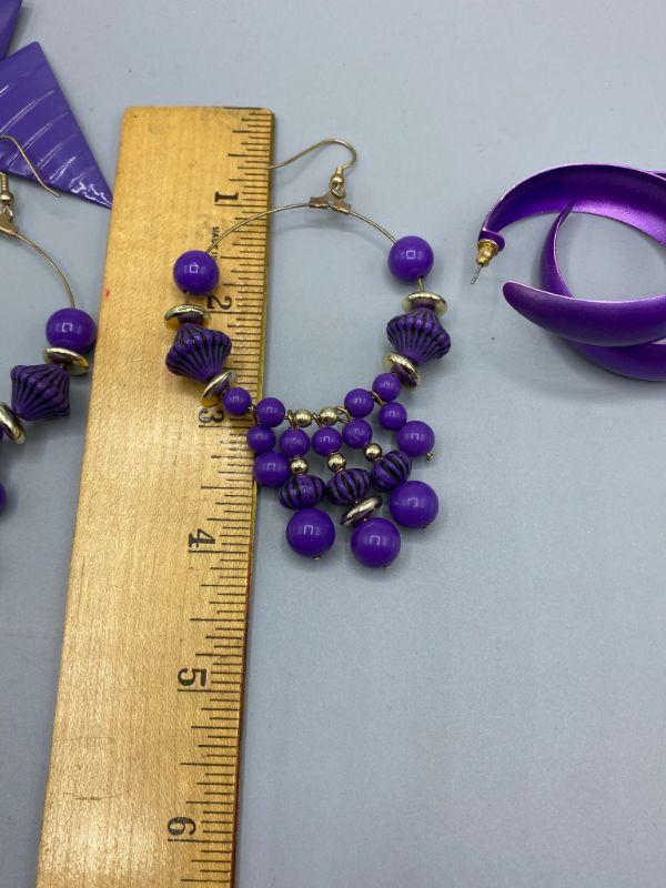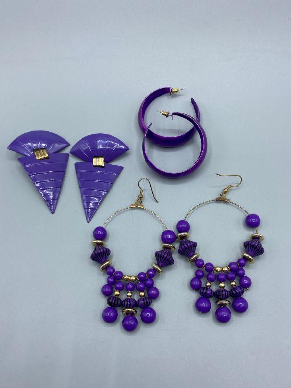 3 pairs of 80s retro style earrings. All are purple color and for pierced ears.