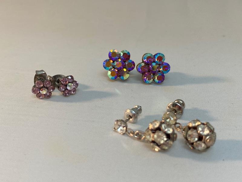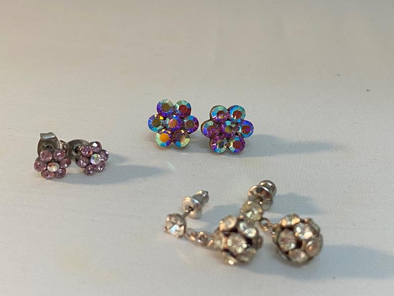 Small rhinestone earrings. 3 pairs. Colorful AB flowers, small pale pink flowers, and rhinestone ball dangle earrings.