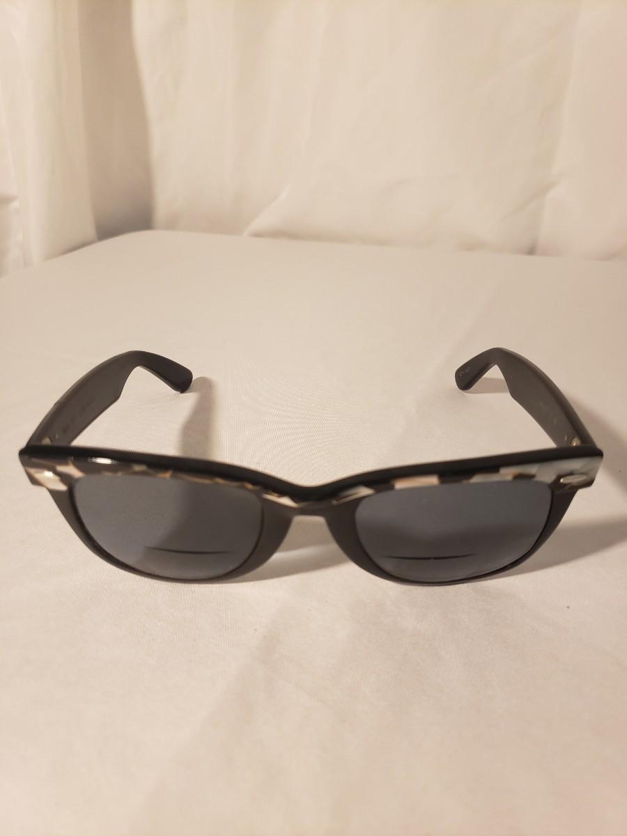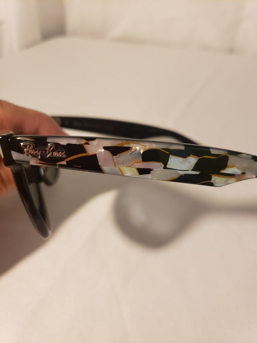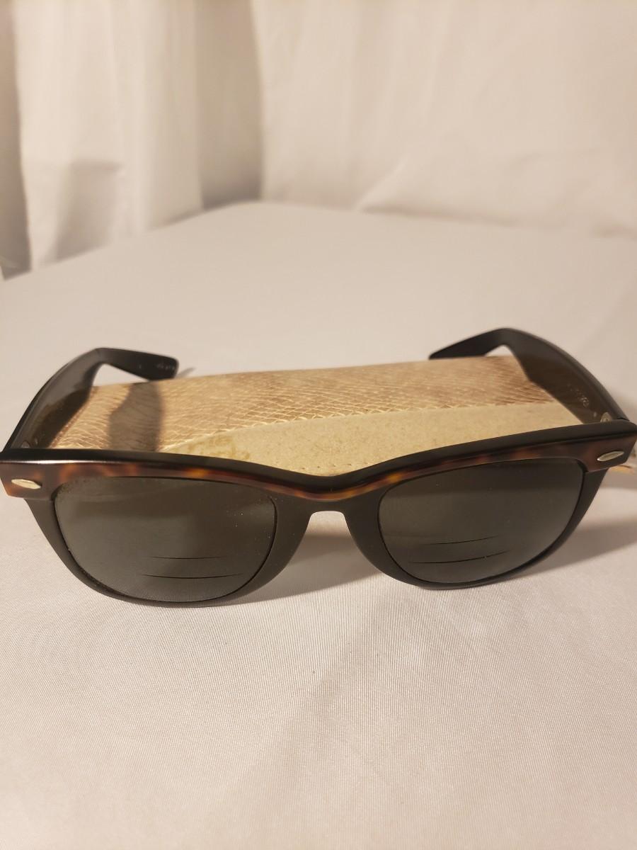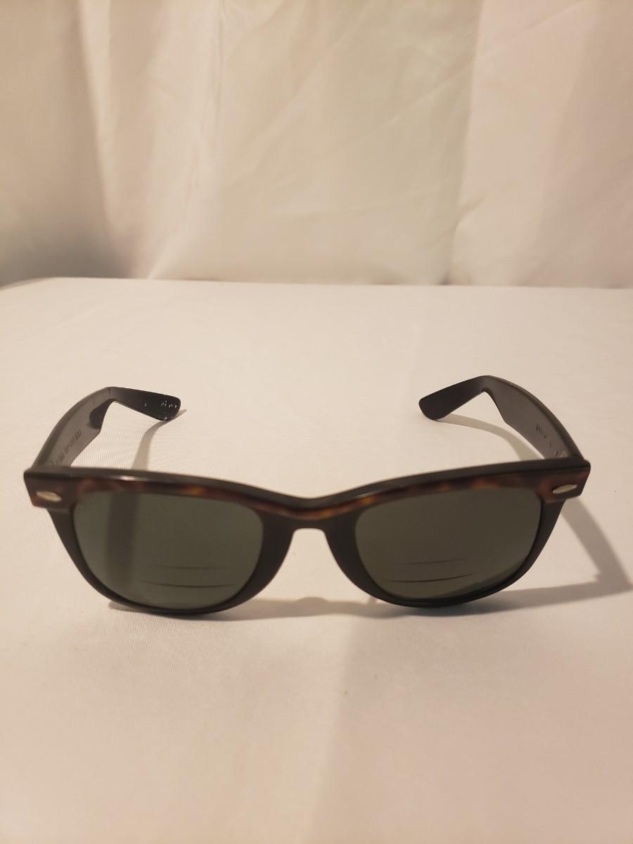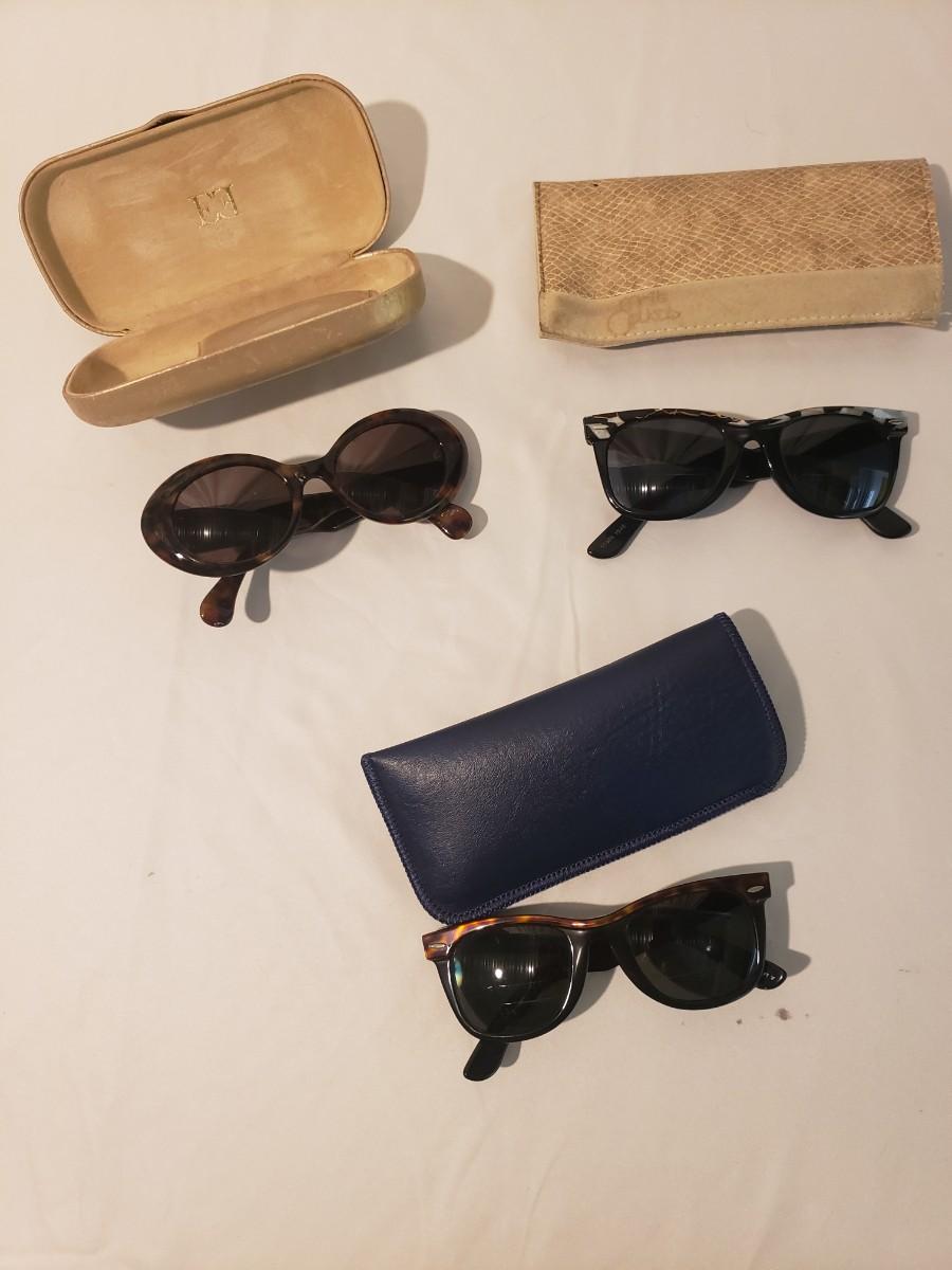 There are two pairs of Ray Ban sunglasses that are prescription as you can see the lines on the lenses in the pictures, as best as it can show. One pair has brown tortoise shell arms (there is some wear on the ends of the arms) and the other one has a mother of pearl mosaic on the arms and appear to be in good condition. Both Ray Bans come with a soft case.