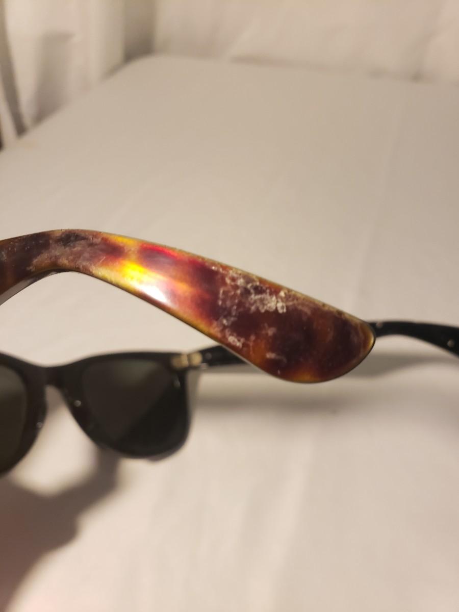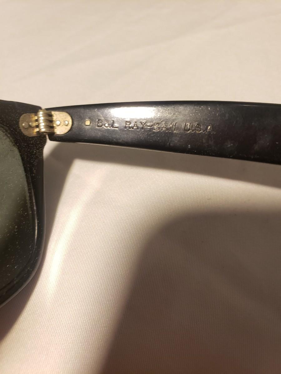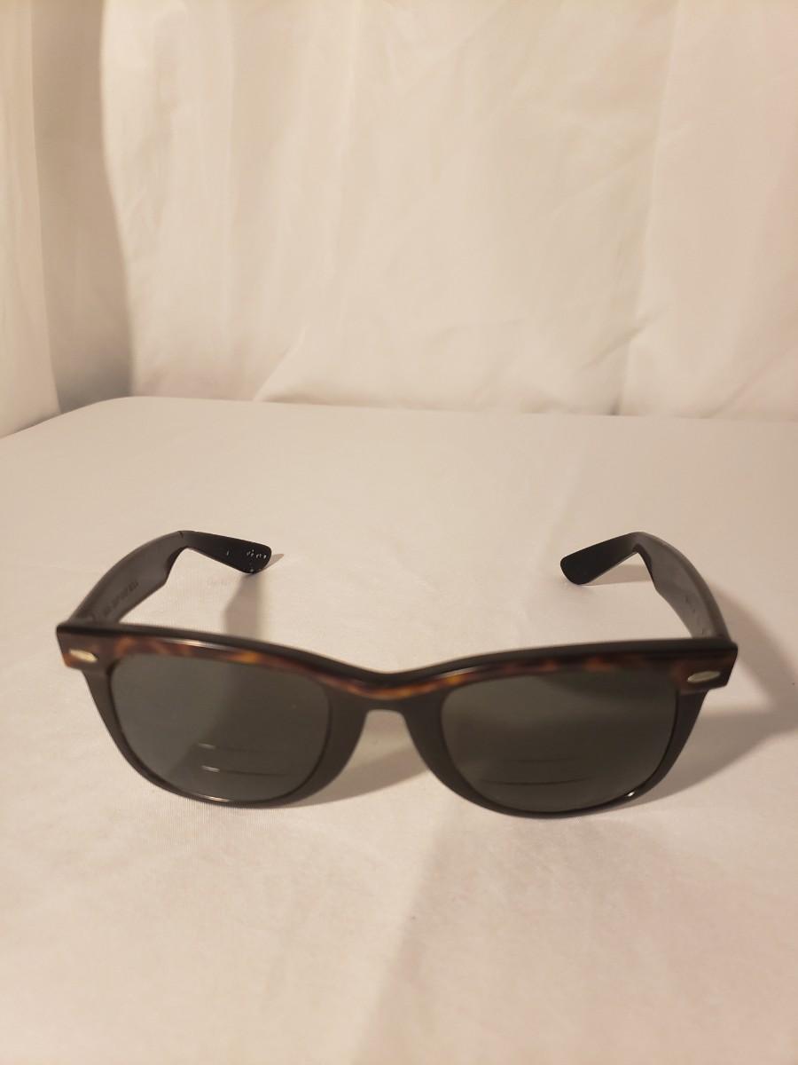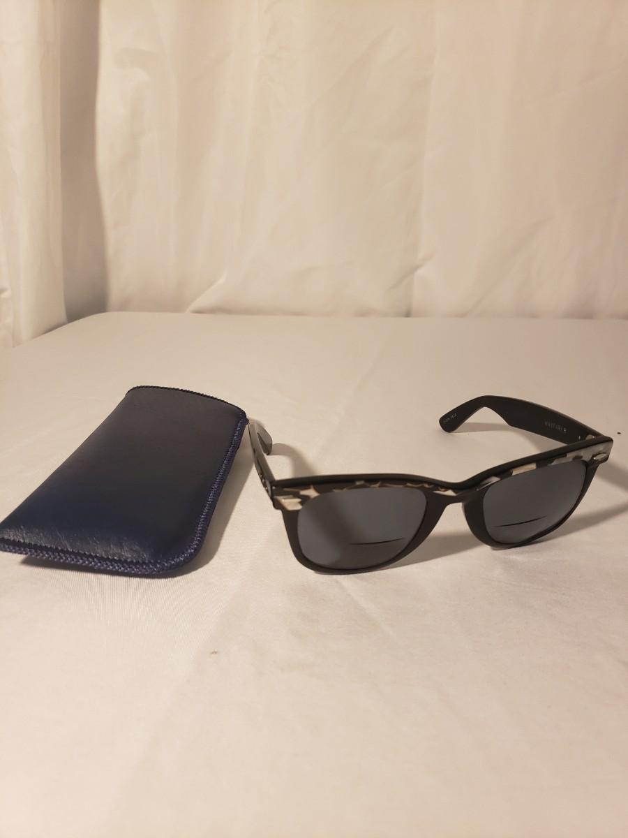 There are two pairs of Ray Ban sunglasses that are prescription as you can see the lines on the lenses in the pictures, as best as it can show. One pair has brown tortoise shell arms (there is some wear on the ends of the arms) and the other one has a mother of pearl mosaic on the arms and appear to be in good condition. Both Ray Bans come with a soft case.