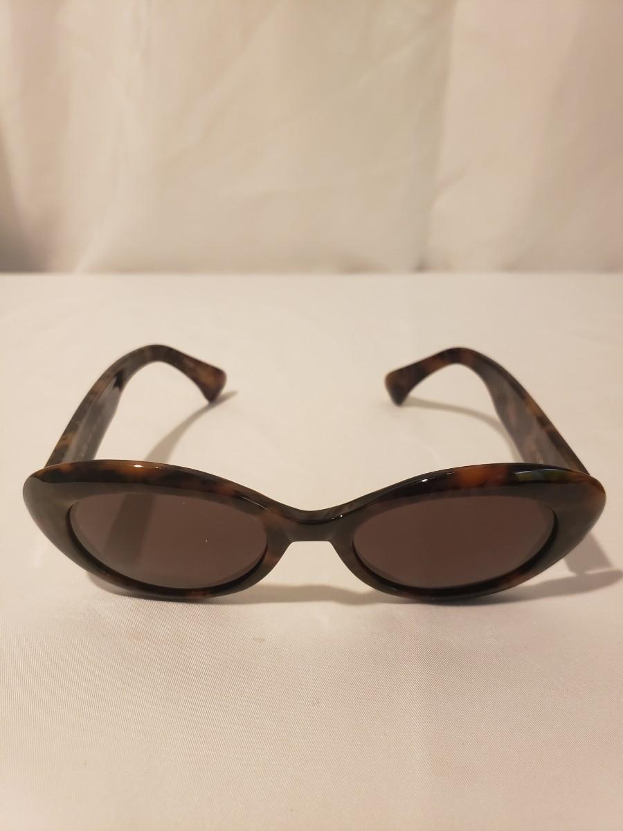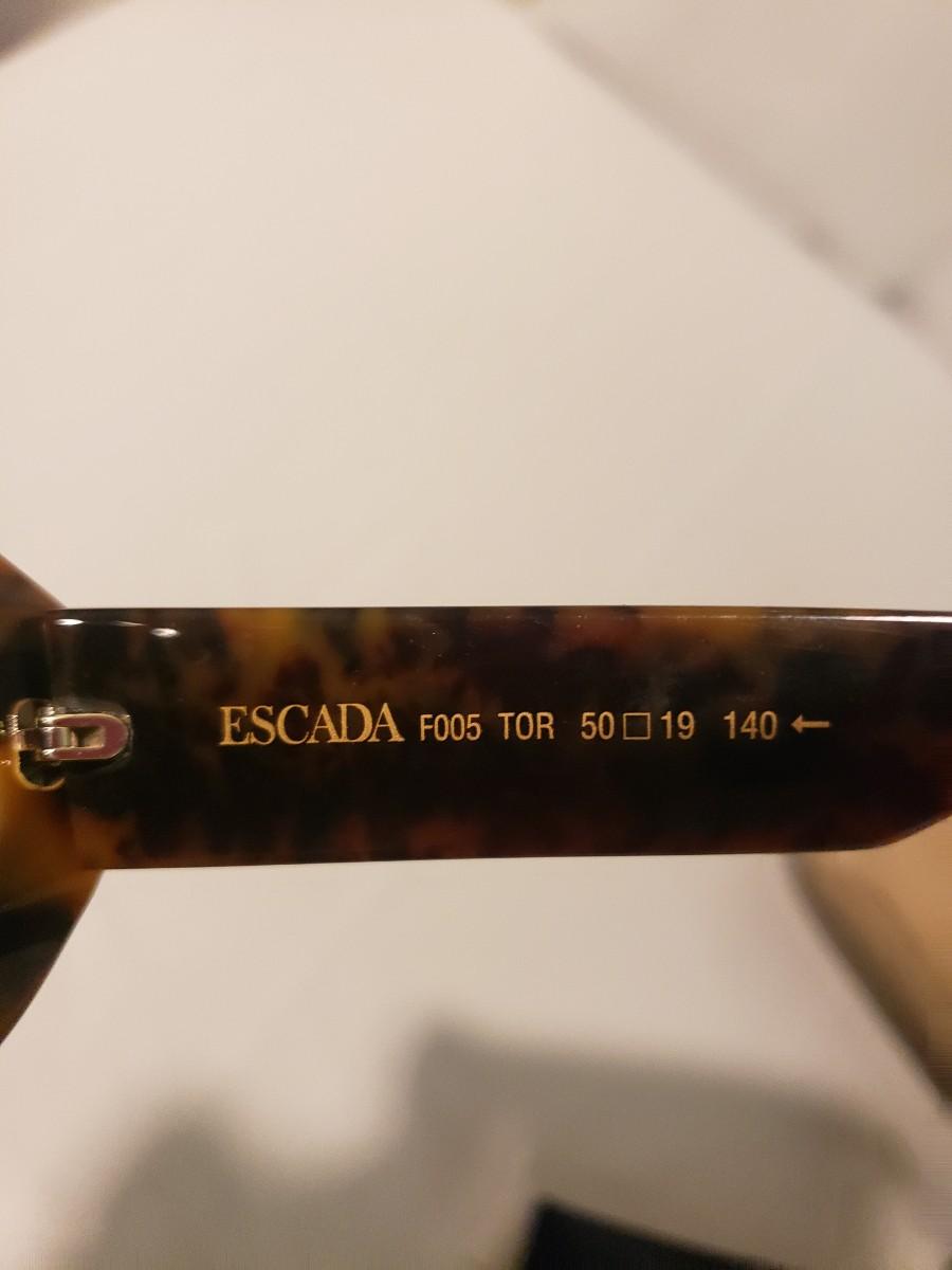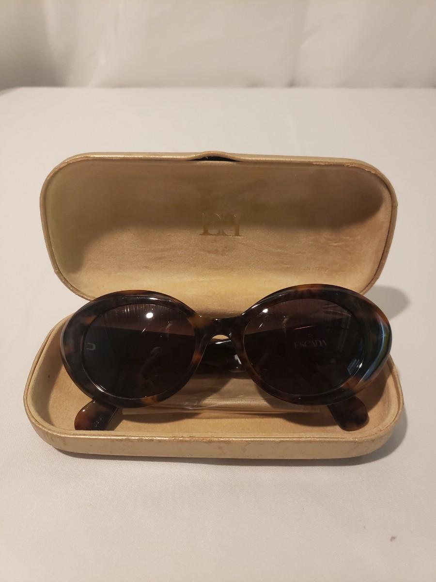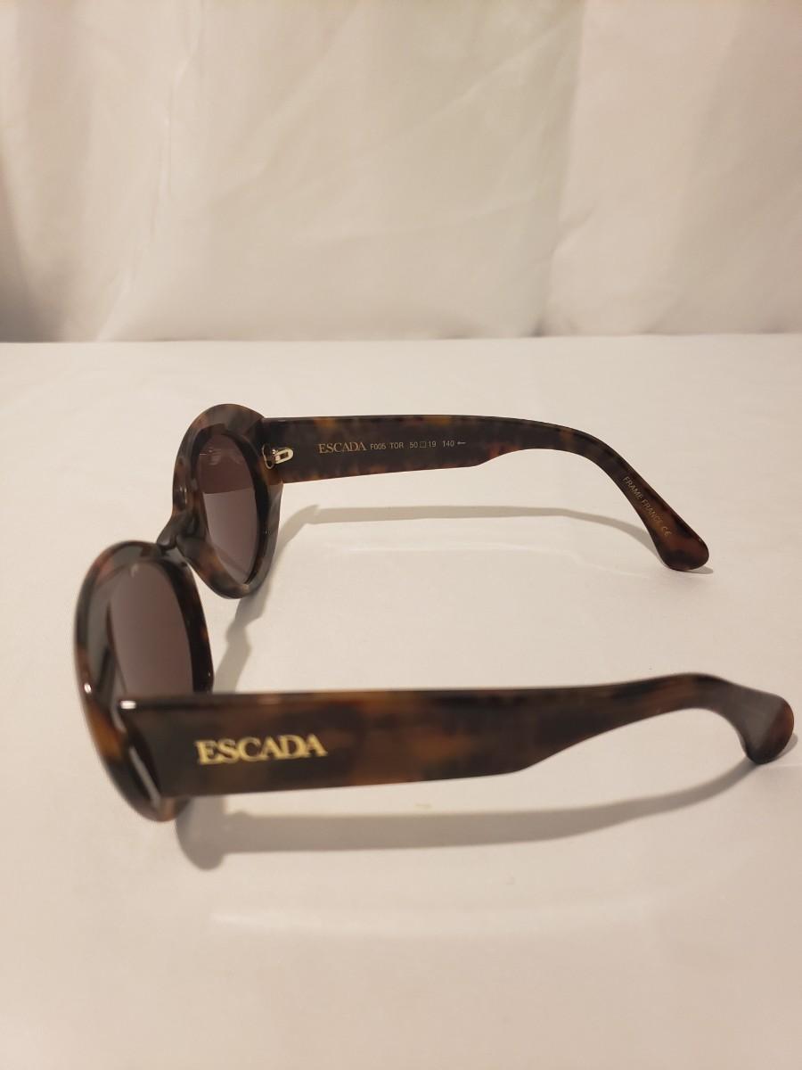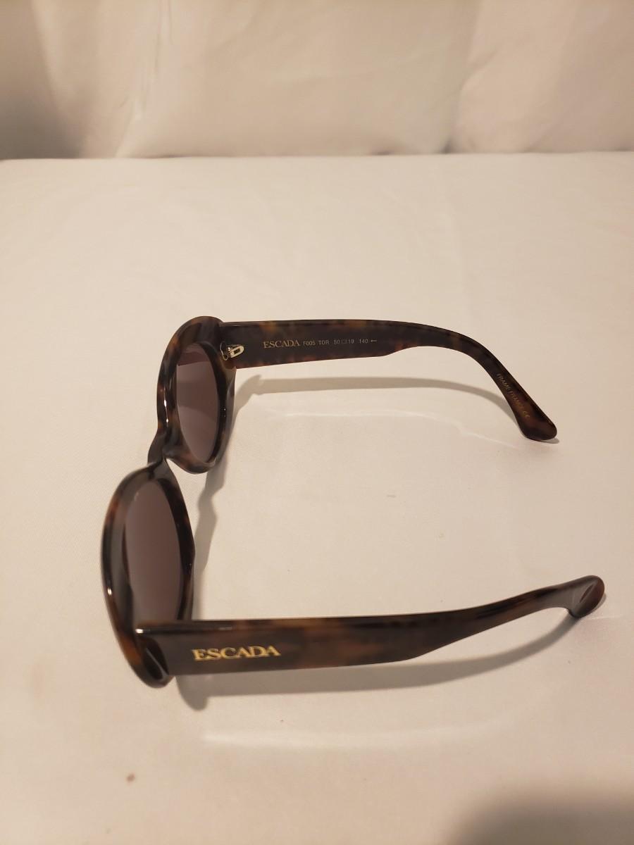 The Escada sunglasses come in a hard case and measure 6 inches across the front and are a brown tortoise shell style.