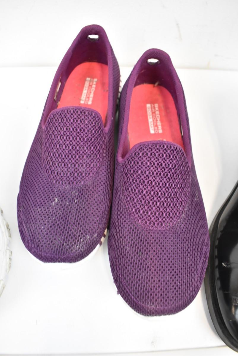 3 pairs women's shoes: White Sketchers size 7, Purple Sketchers size 7.5, Black Boots size 39